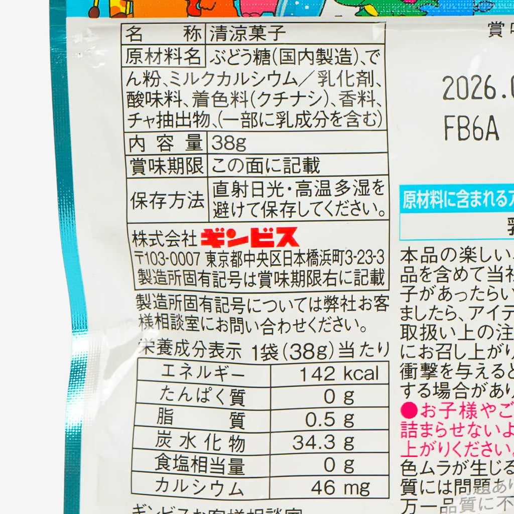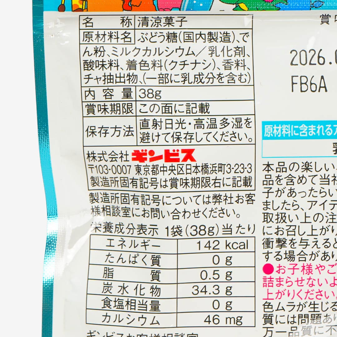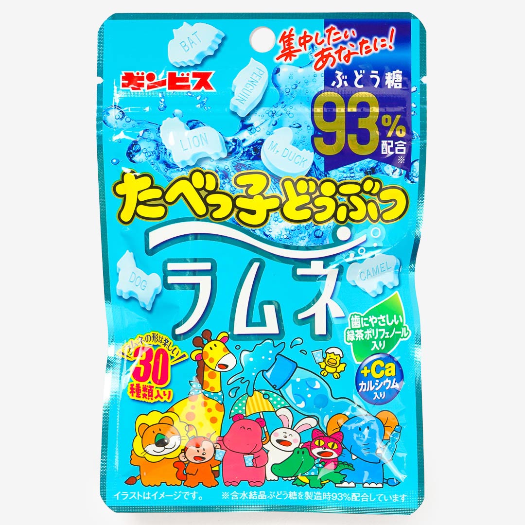 Ramune is a popular carbonated soft drink in Japan. Enjoy the refreshing taste of ramune with these animal-shaped candies! They're inspired by Ginbis Animal biscuits. Firm and tasty, these candies are made with 93% glucose with polyphenols and calcium that's gentle on the teeth.