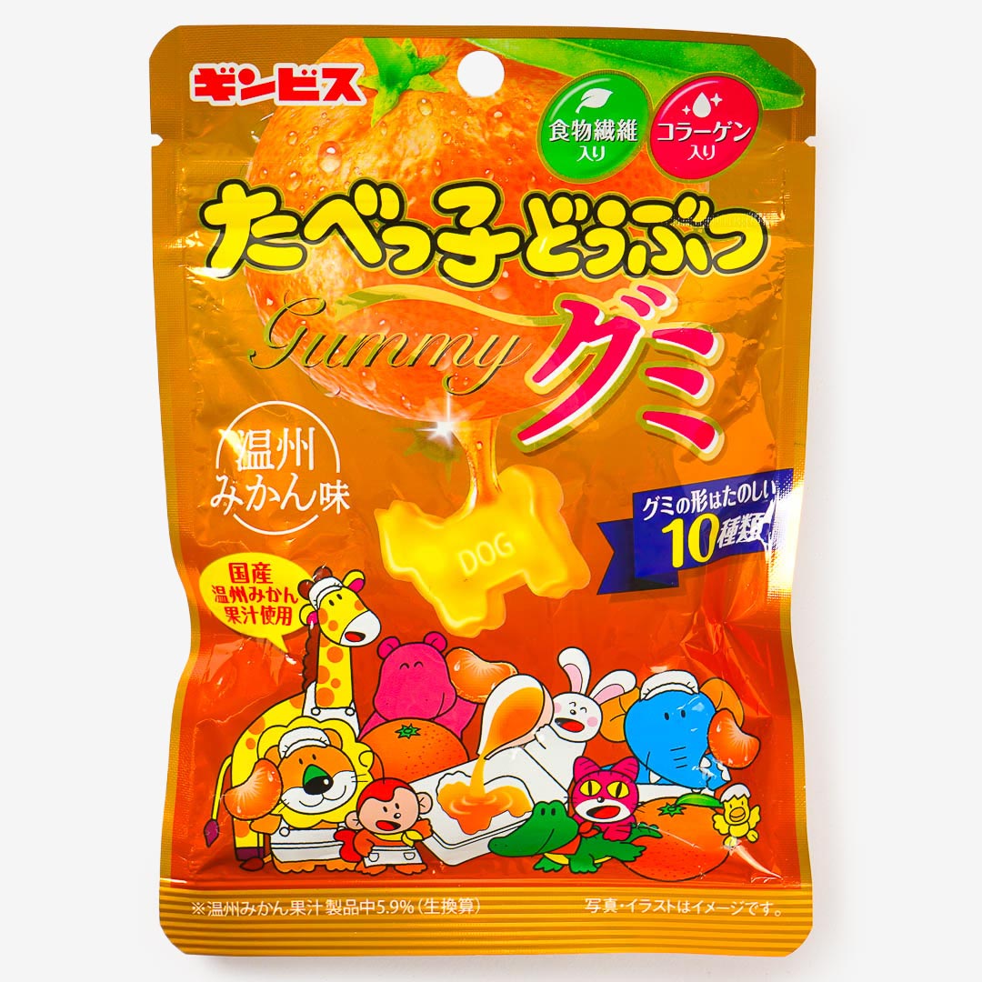 Enjoy nibbling on this pack of tasty Unshu mandarin-flavored gummy candies! Each piece is shaped like the animals from Tabekko animal biscuits.