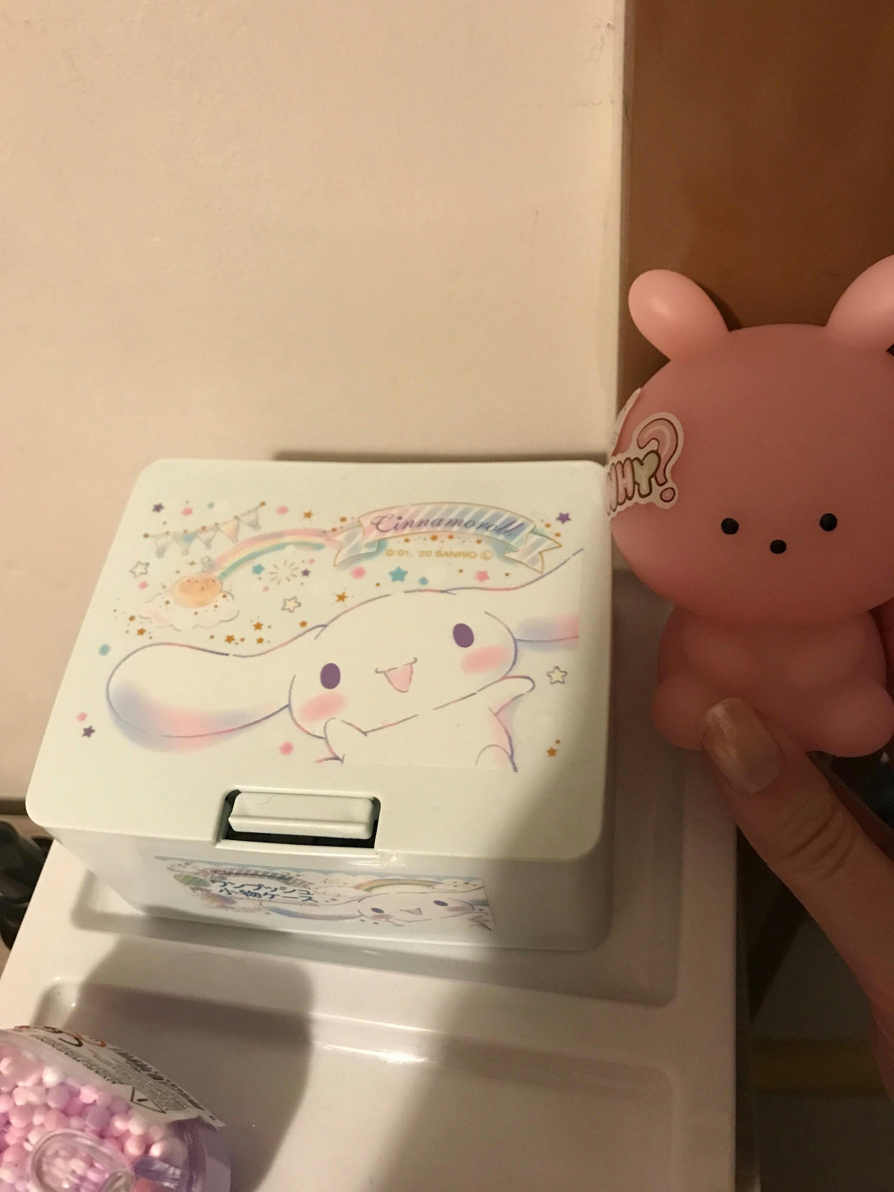 This kawaii storage case has a special button that makes it easier to open and close it using just one finger! Store your loose change and other small items inside. The mini box comes decorated with illustrations of a smiling Cinnamoroll!