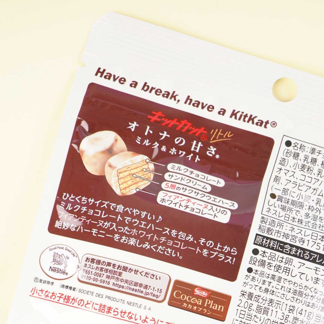 A pack of bite-sized, milk and white chocolate-coated wafer treats with fiantine