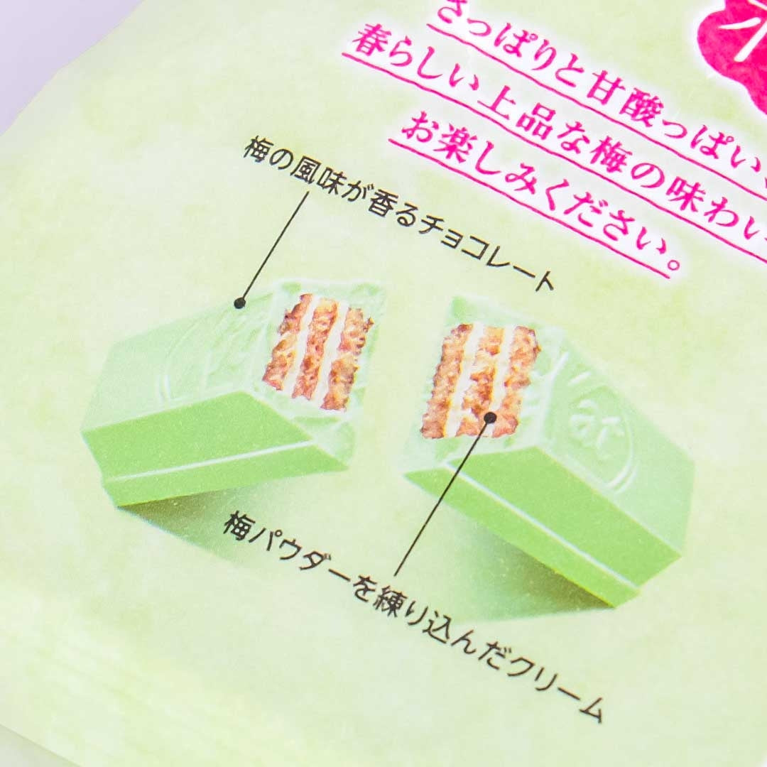 Relish the mix of tangy and sweet with these mini choco wafers covered in Japanese plum or ume-flavored white chocolate. These spring-edition treats are filled with plum-flavored cream in between the wafer layers.