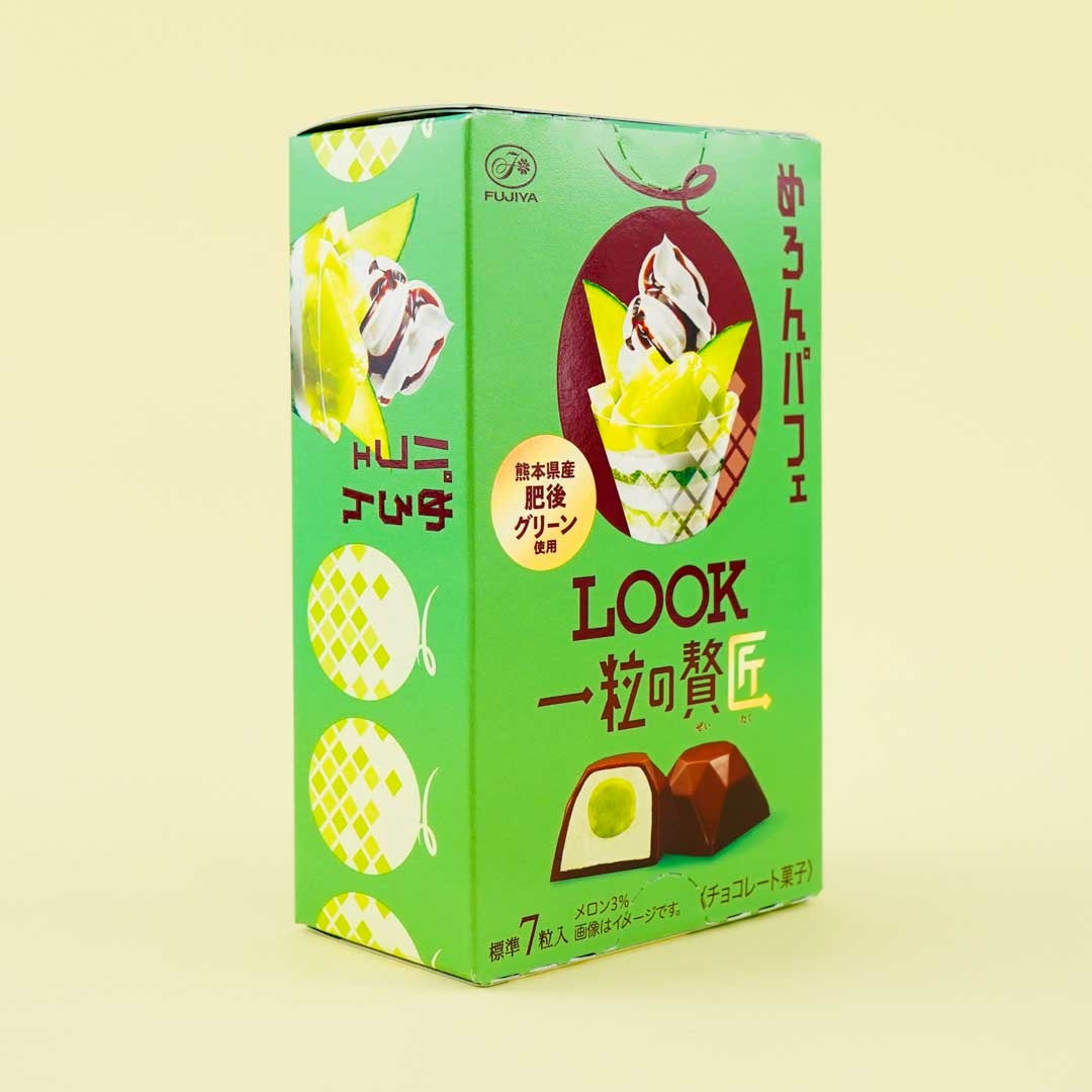 A box of bittersweet chocolate bites filled with melon parfait-flavored cream filling