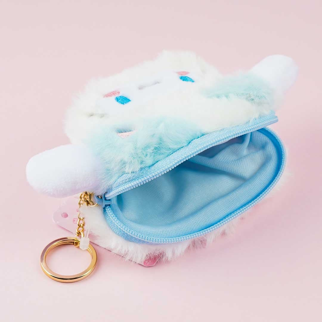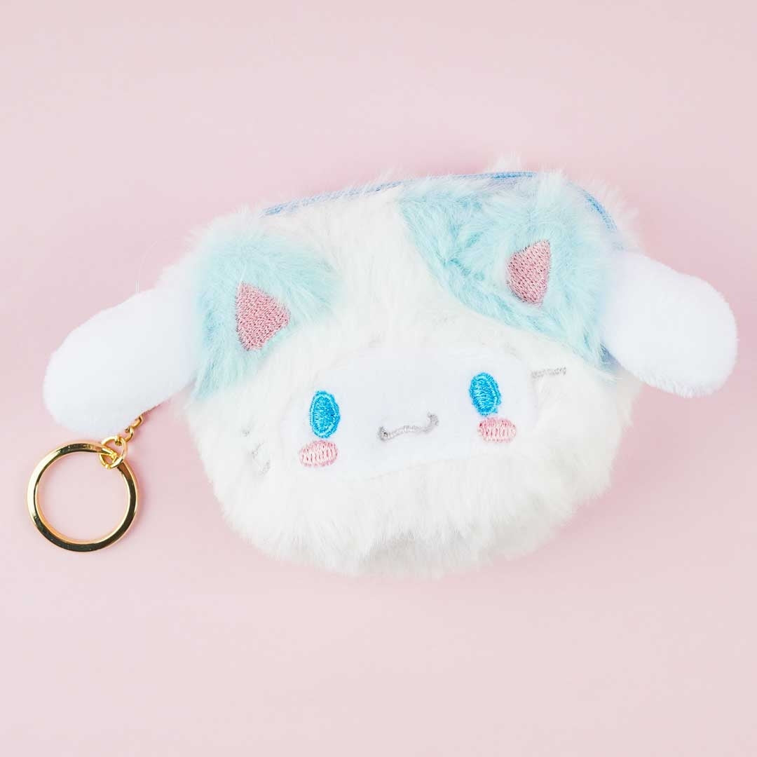 Cinnamoroll is wearing a cute cat costume in this fluffy pouch. Use it to store your trinkets and other knick-knacks. It has a zipper closure and a metal keyring.