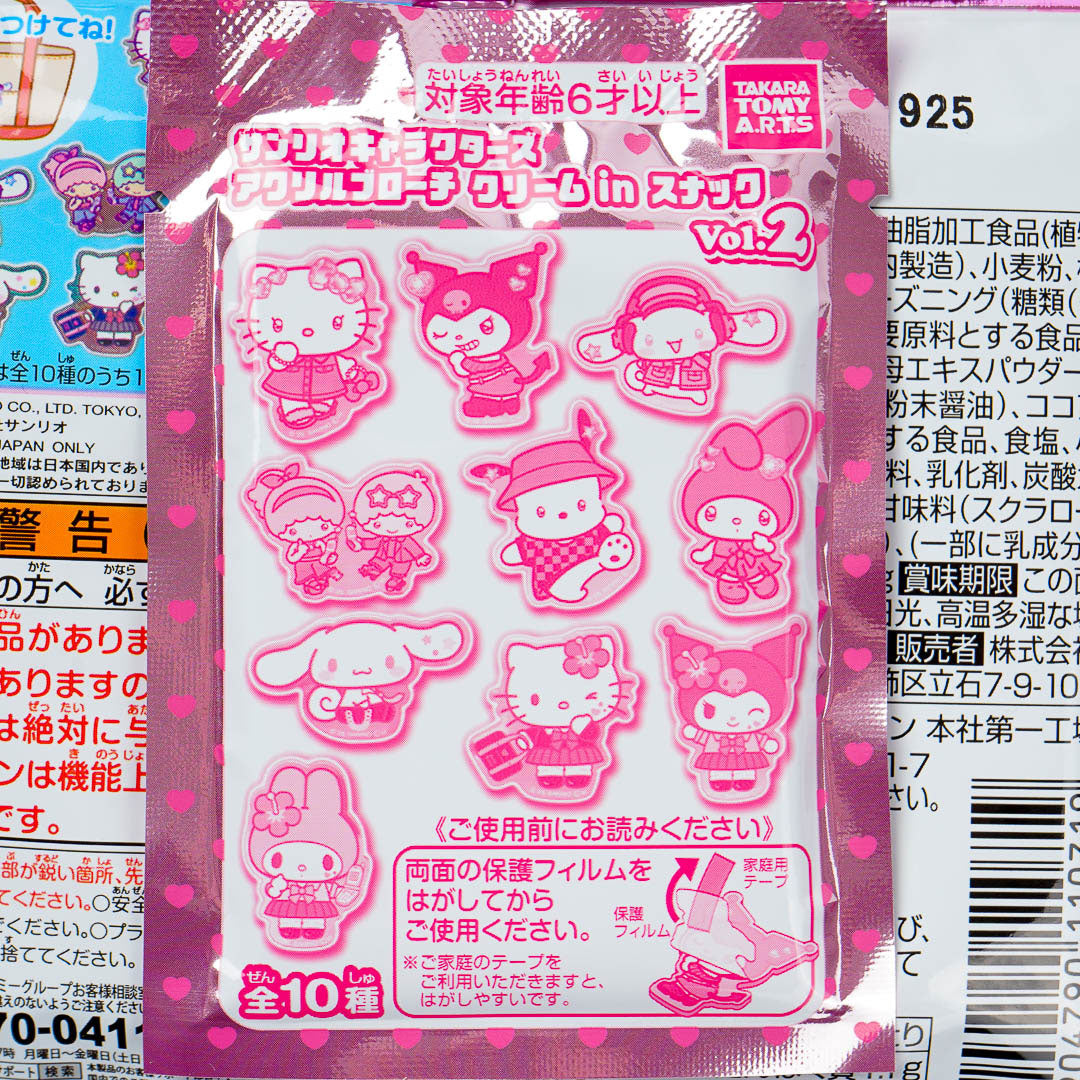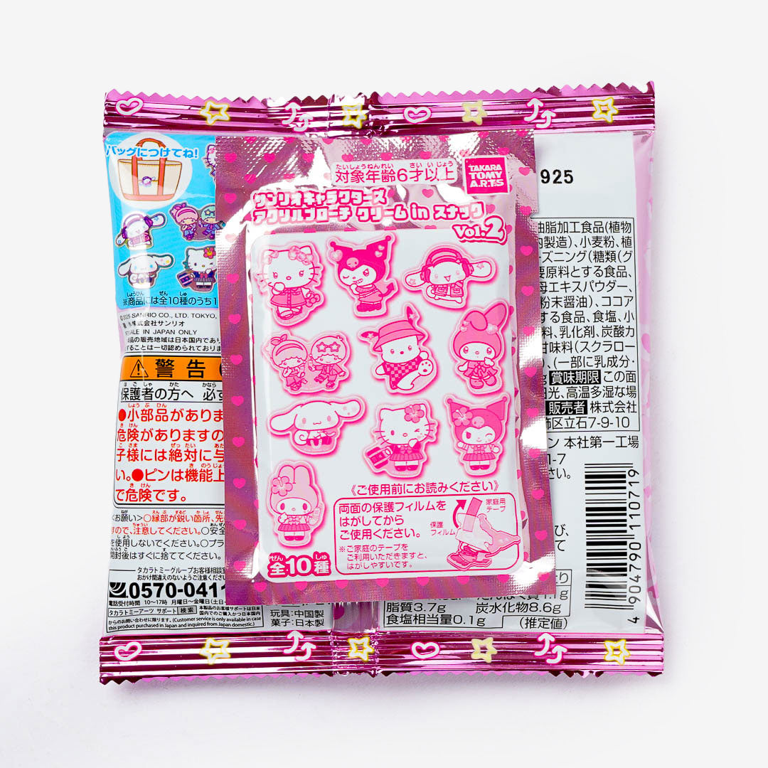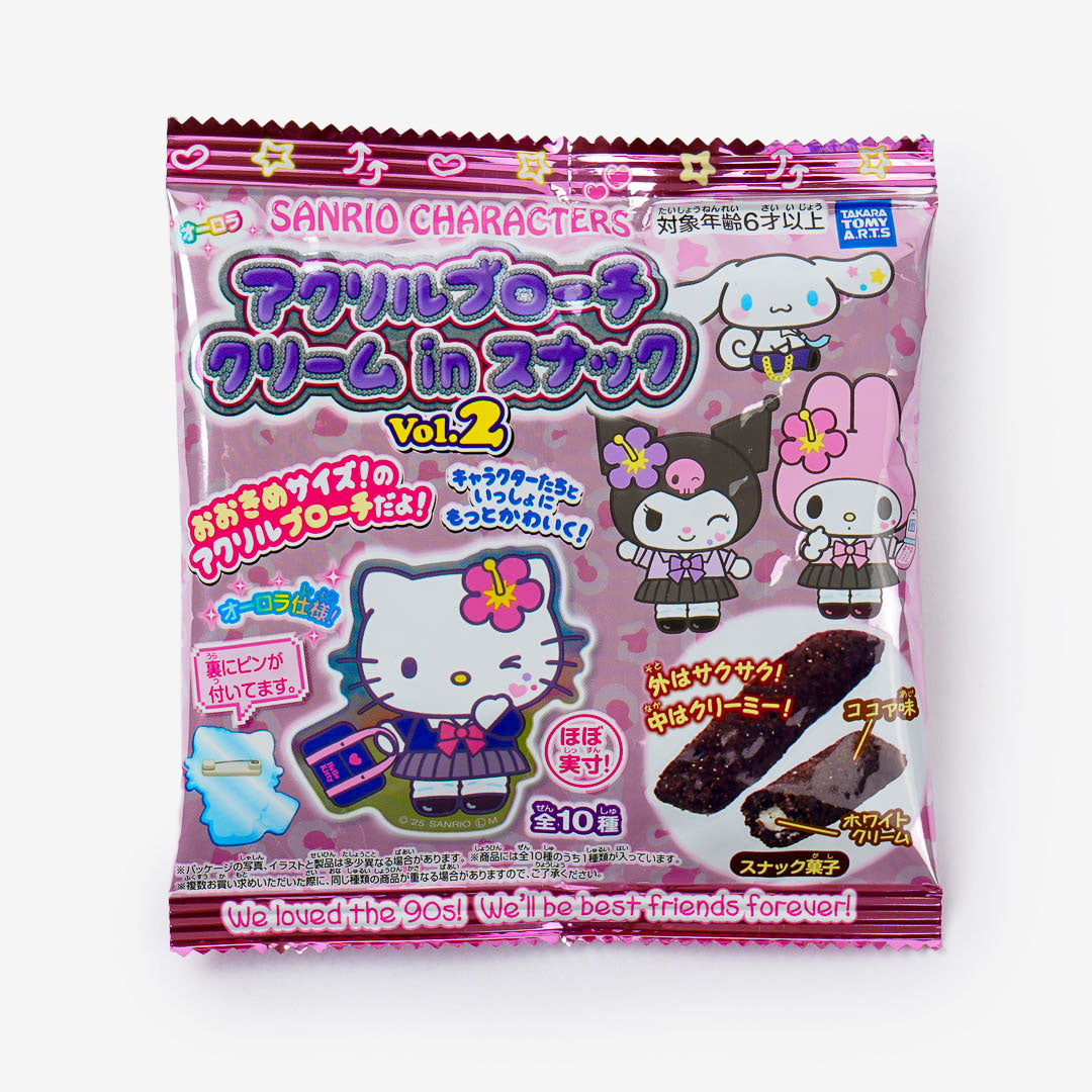 Want a snack that comes with a cute collectible? This snack pack gives you both! It includes a crispy cocoa wafer stick filled with smooth white cream. Inside the pack, you also get an acrylic brooch featuring your favorite Sanrio Characters in school uniform. Enjoy the sweet wafer snack, then pin the brooch on your bag, jacket, or pouch!