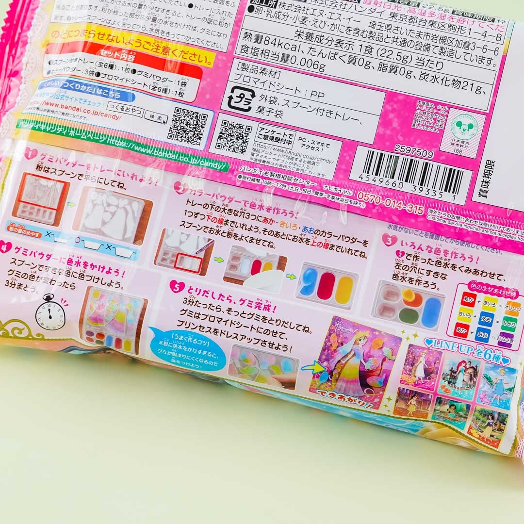 Contents: 1 x gummy powder, 3 x colored flavoring powder (yellow, red, blue with soda, grape, and orange flavors), 1 x mold with spoon, 1 x Disney card