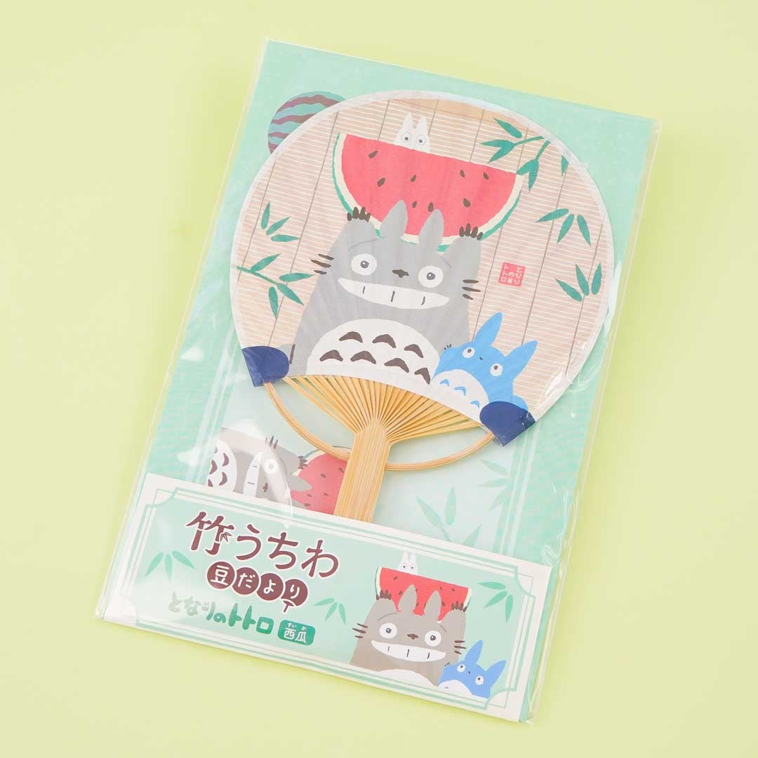 A cute bamboo fan-shaped greeting card showcasing My Neighbor Totoro characters playing with watermelon