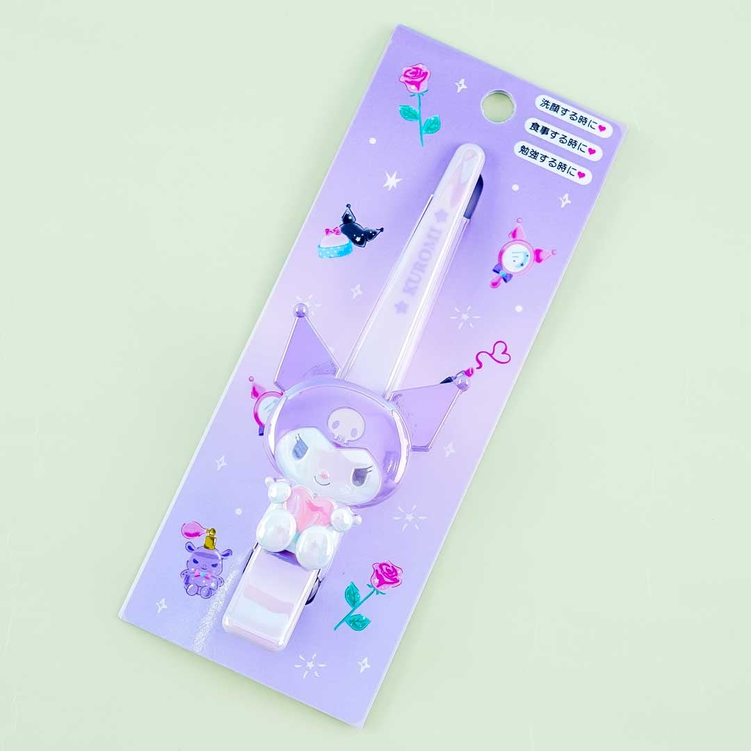 A cute metallic long clip featuring a Kuromi charm with a shiny finish