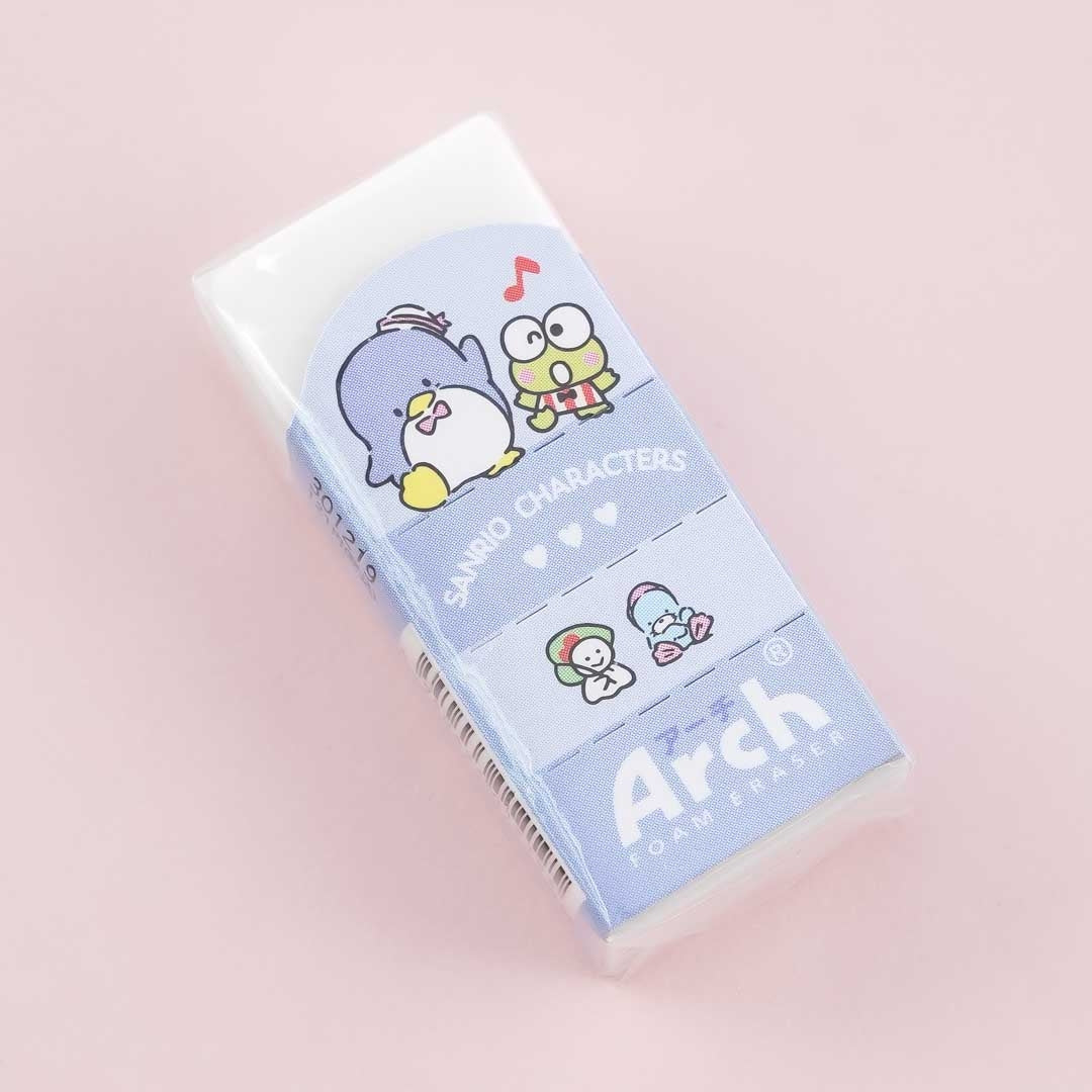 This eraser features Tuxedosam and Kero Kero Keroppi! Use this unique plastic foam eraser to keep your sketches clean! It comes with an arched cardboard case with perforations which makes breakage minimal compared to regular erasers.