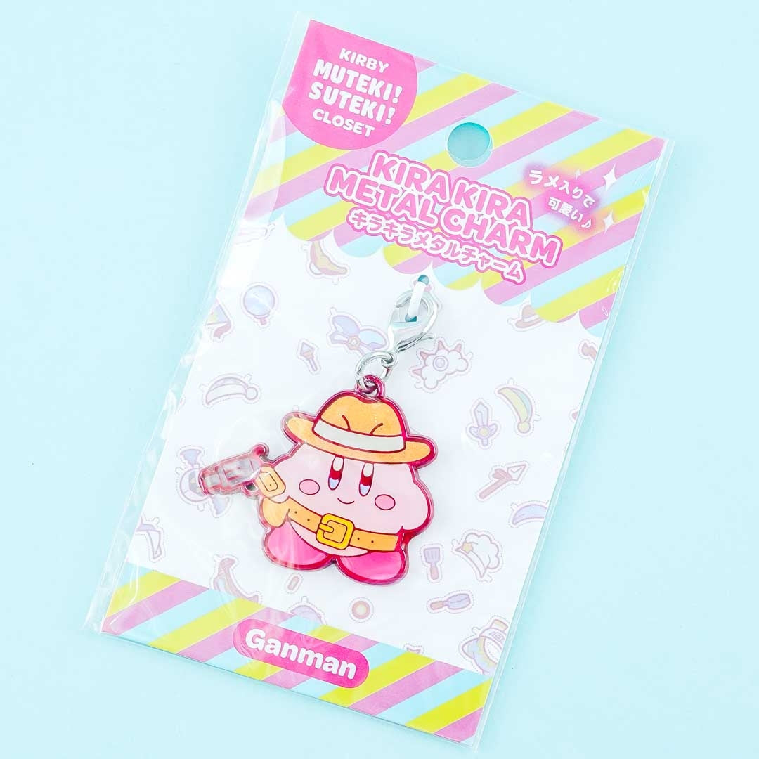 This bag charm features Kirby wearing a cowboy costume! You can easily attach this to your favorite purse with its metal clip. It also features fancy glittery details and golden-red borders!