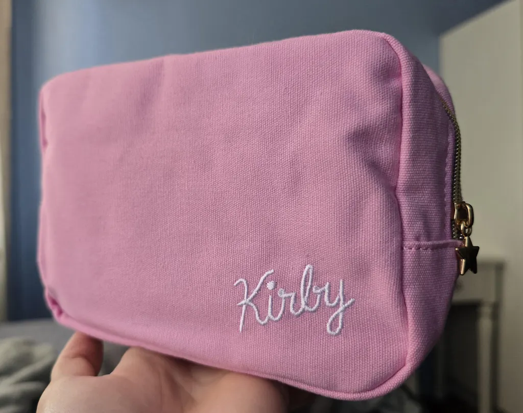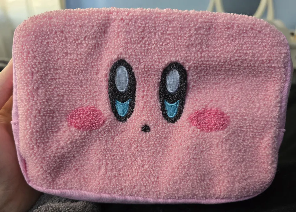 Keep your makeup or skincare essentials inside this furry pink pouch! It has a special embroidery of Kirbys face and has a roomy compartment so you can store lots of items inside.