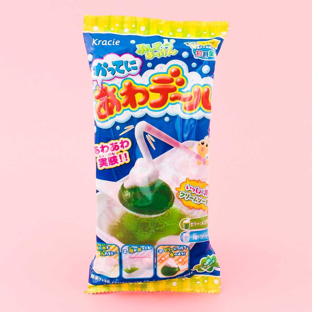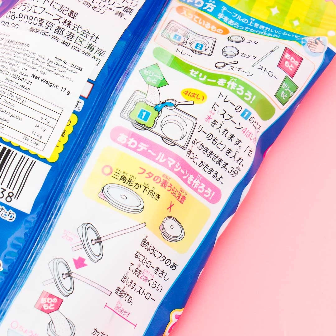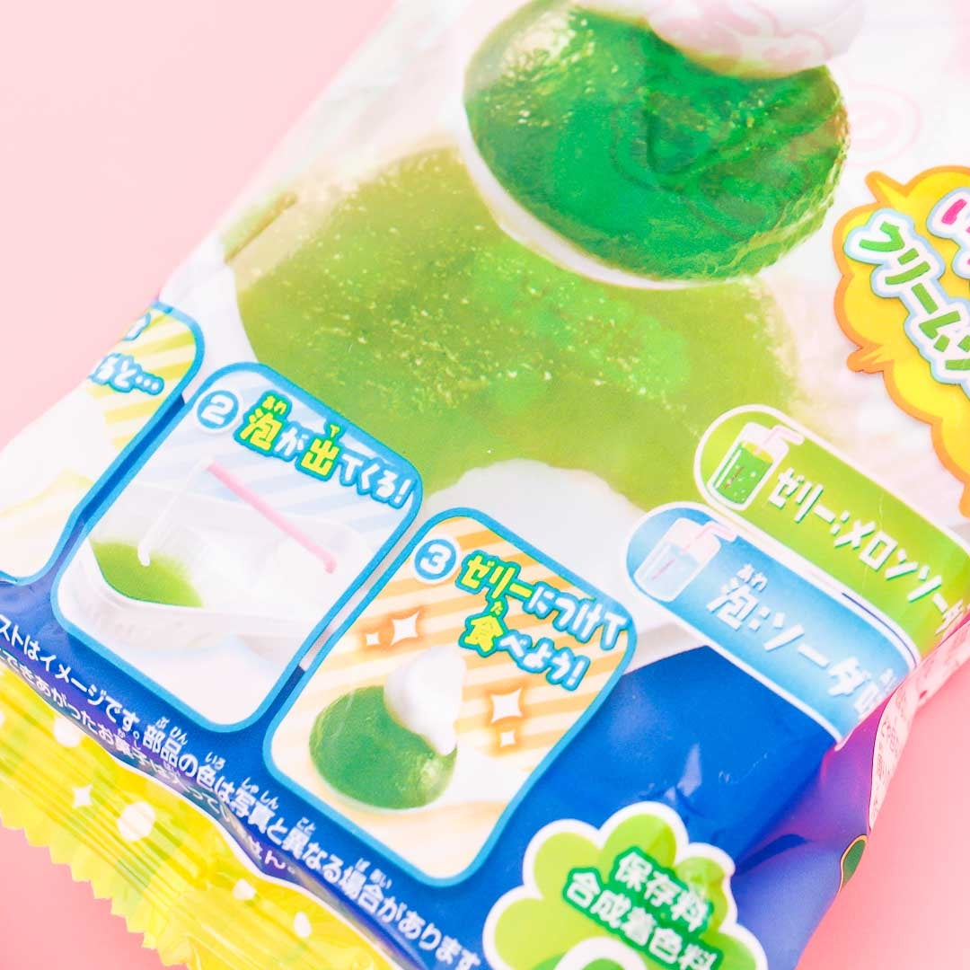 Kids and adults will enjoy this fun and flavorful DIY candy kit! First, add water to the jelly powder to make your own refreshing melon soda-flavored jelly. Then mix the foam powder with water, seal it with the straw lid, and watch as scrumptious soda bubbles ooze from the straw! Eat these two concoctions together to discover a totally new candy taste!