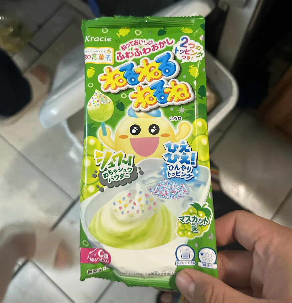 Have fun experimenting with this DIY candy kit! Simply add water and mix the powder. Then watch as the muscat-flavored candy changes color and becomes fluffy! This pack also comes with toppings that you can add as well!
