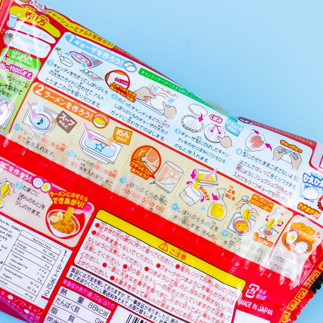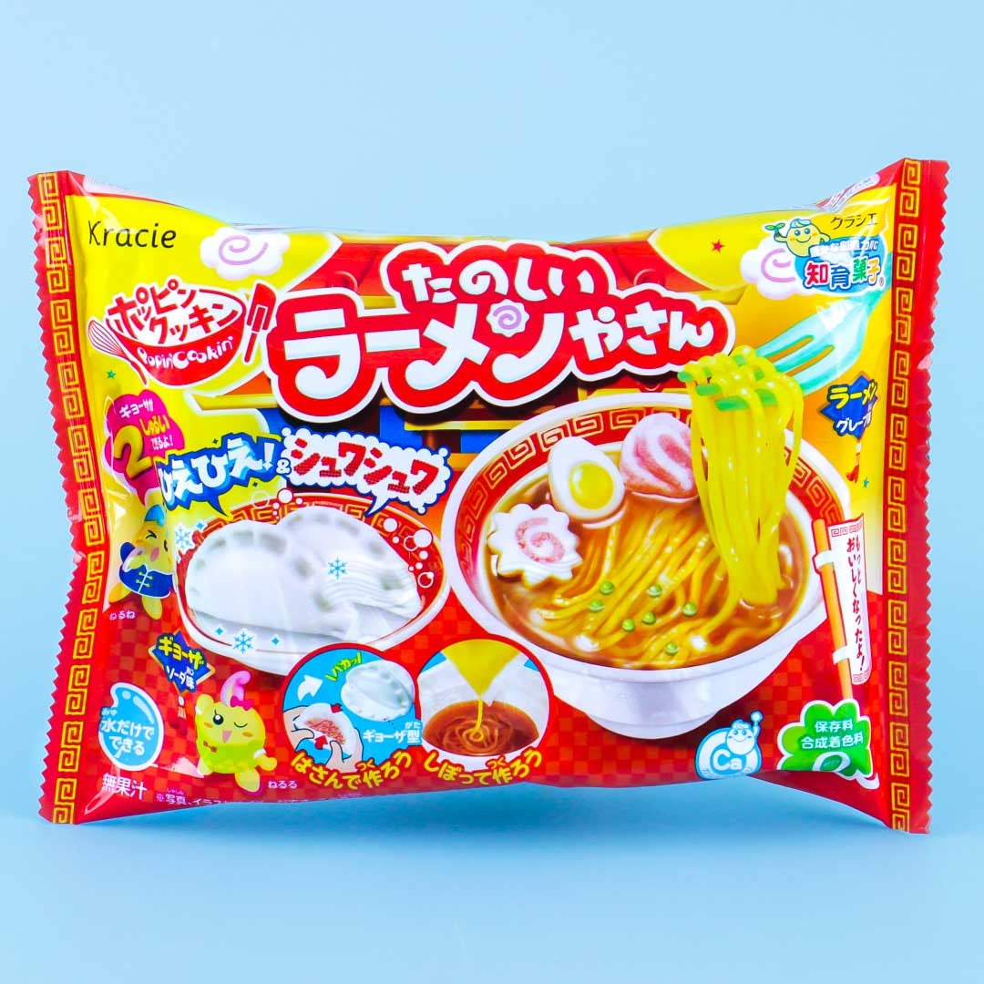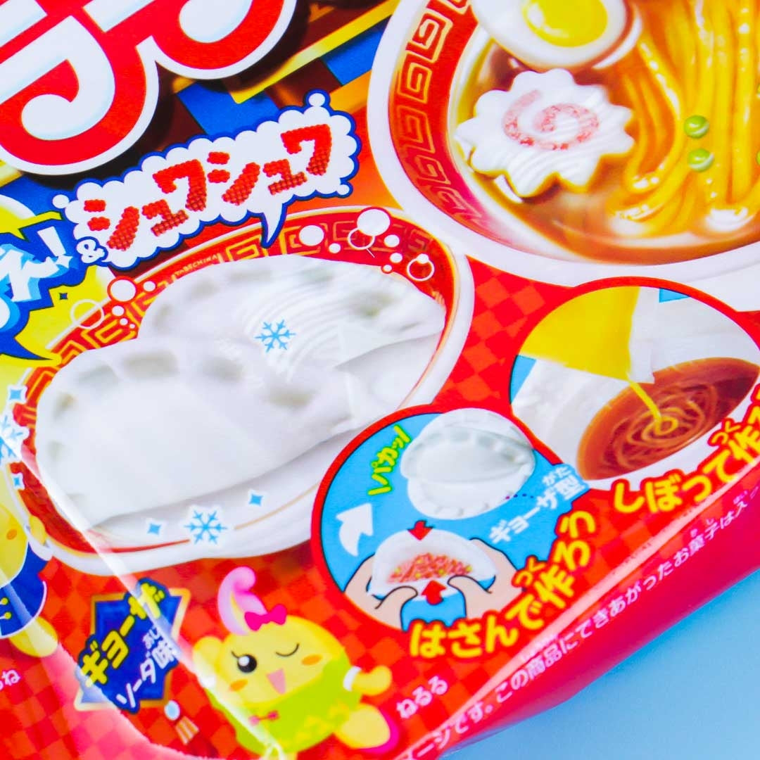 Kracie Popin' Cookin' sets are a fun and interesting way to make familiar dishes as miniature foods from delicious candy materials by only adding water! This is a do-it-yourself set for making your own yummy ramen! By mixing water and the included ingredients you can stir and mold this kit into a delicious ramen meal! The meal includes noodle soup, boiled egg, naruto fish cake and gyoza dumplings, and they are all cola and soda flavored. This kit is great fun for both children and adults! This kit is great fun for children and adults alike!