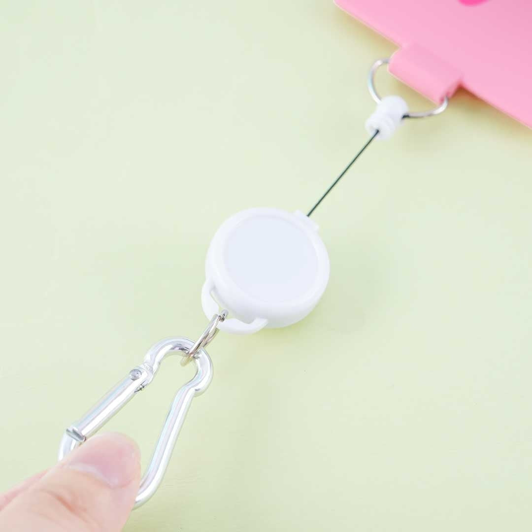 This cute silicone card case features prints of Kirby's face! It has a metal carabiner with a retractable reel. Use it to keep your cards safe!