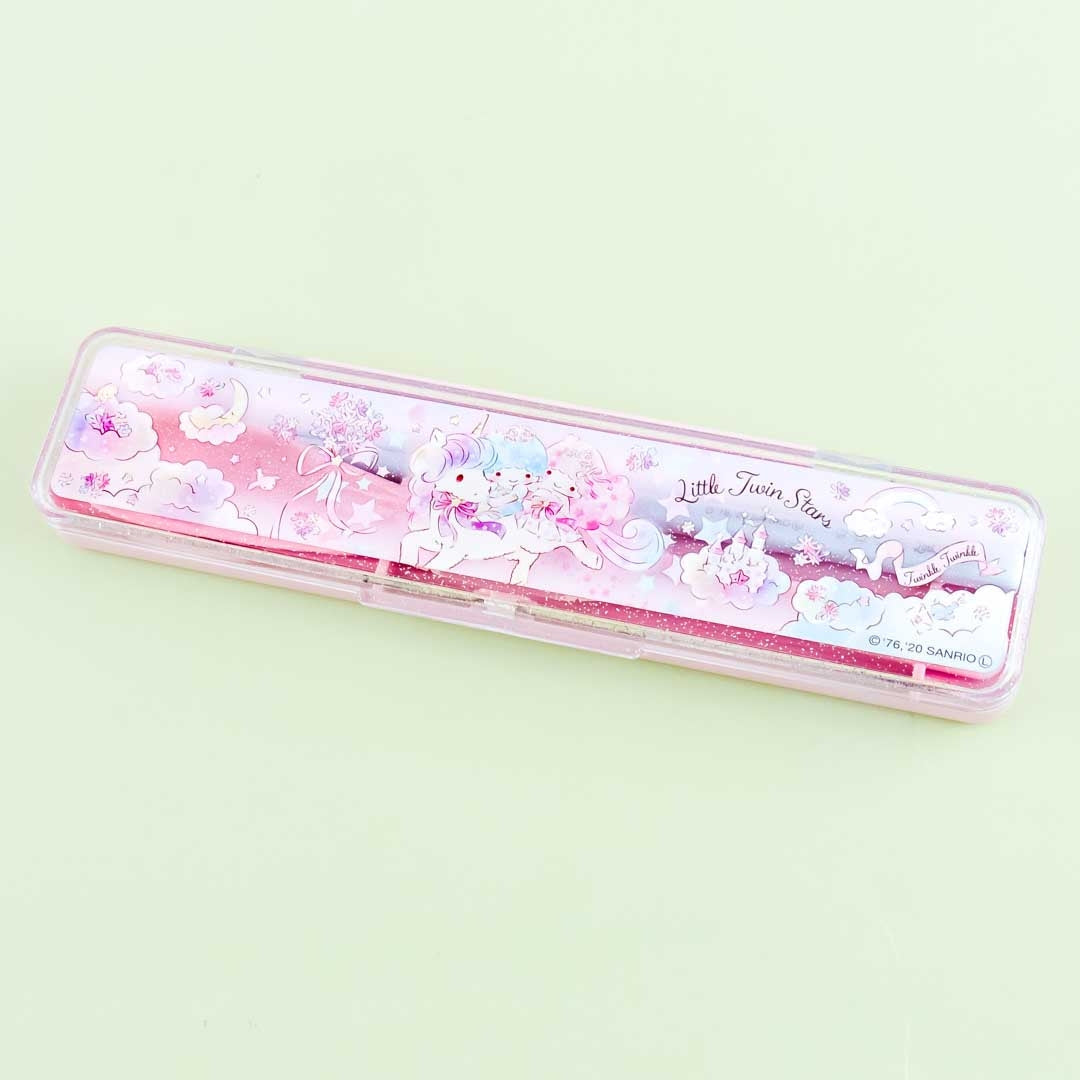 Bring this super cute utensil set with you every time you travel! The spoon and chopsticks with non-slip tips are labeled with Little Twin Stars. It features Kiki and Lala celebrating while riding a unicorn on the glittery flip-top case. The case lid has a silicone lining so it won’t make noise when you close it. You can clean this set via the dishwasher!