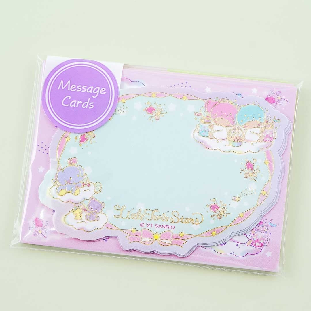 Be inspired to send short handwritten letters to your family using this kawaii set of die-cut message cards! These cards, along with the matching envelopes and sticker sheet — are all decorated with prints of the Little Twin Stars harvesting star-shaped fruits with their friends!