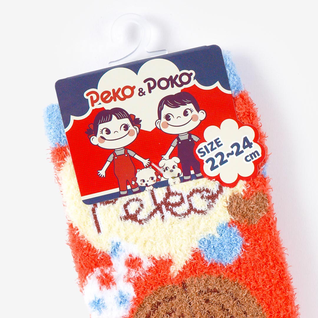 Keep your feet warm while relaxing at home using these fluffy socks! It's decorated with prints of Peko-Chan and floral candies.