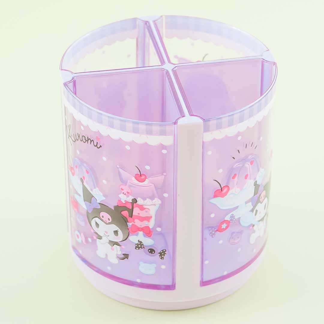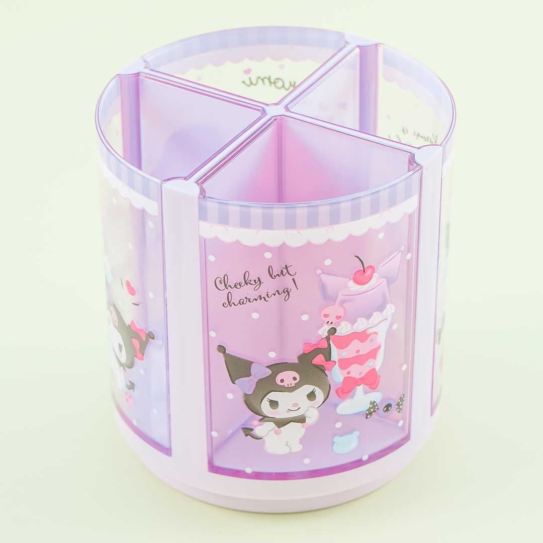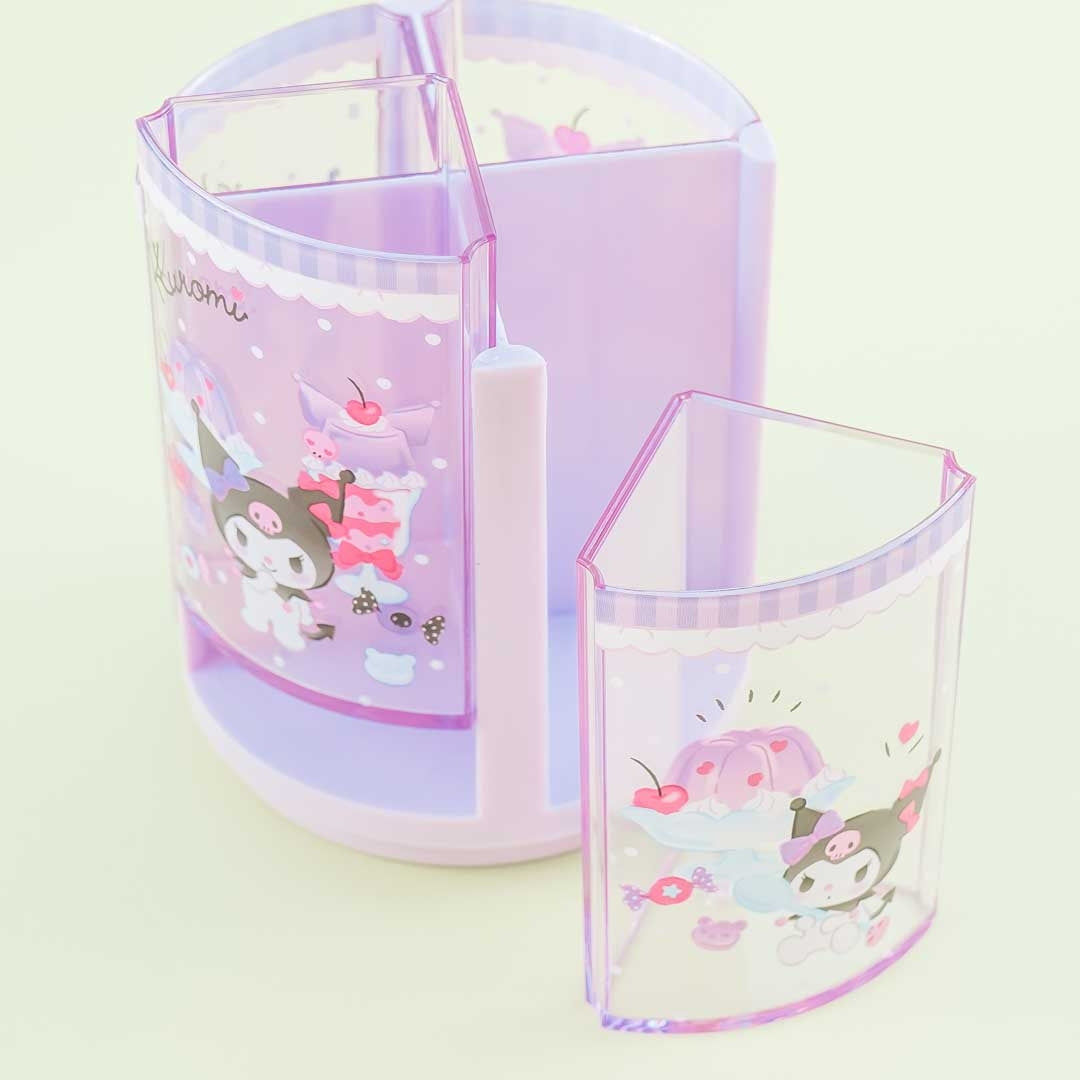 A kawaii rotating pen stand featuring prints of Kuromi with different kinds of sweet treats