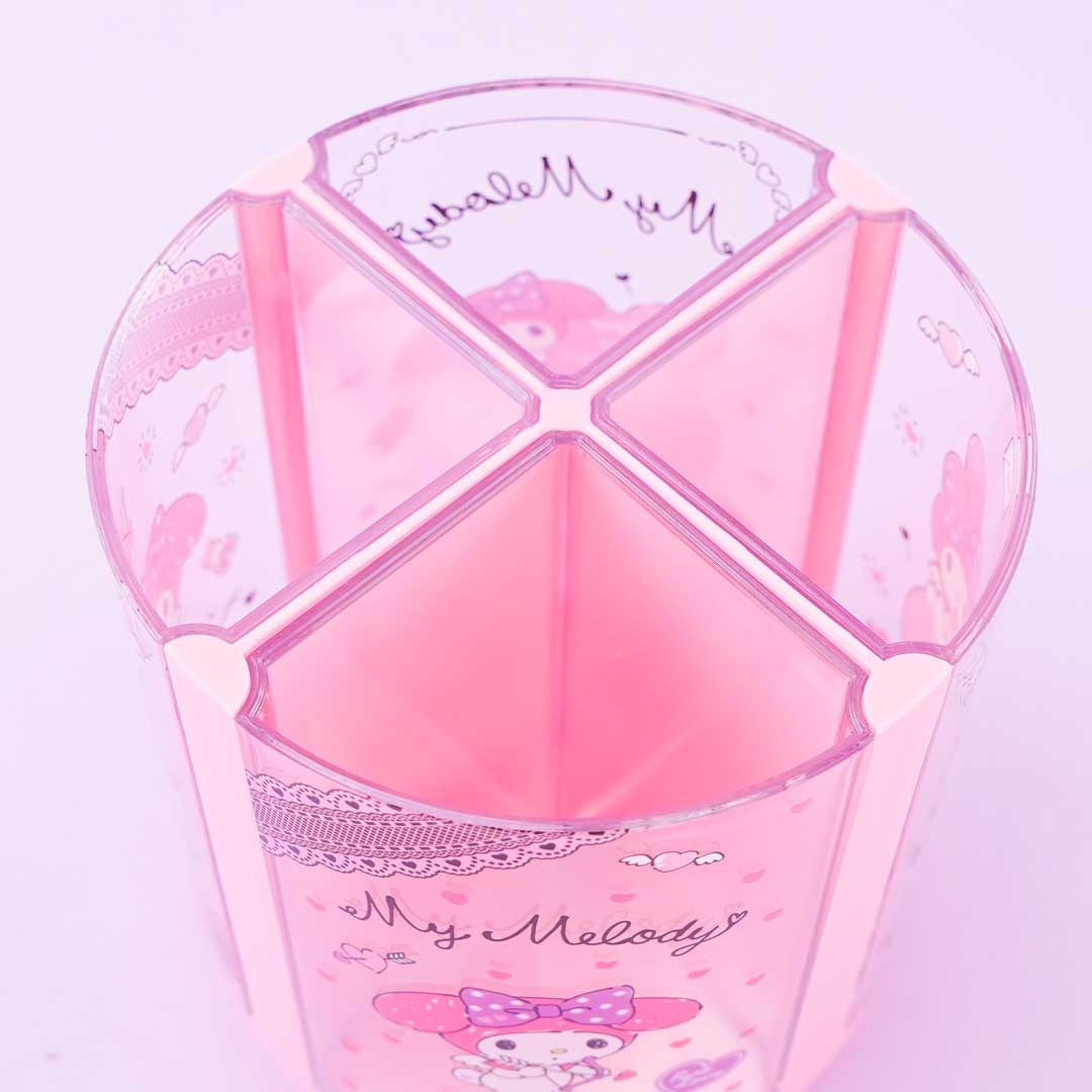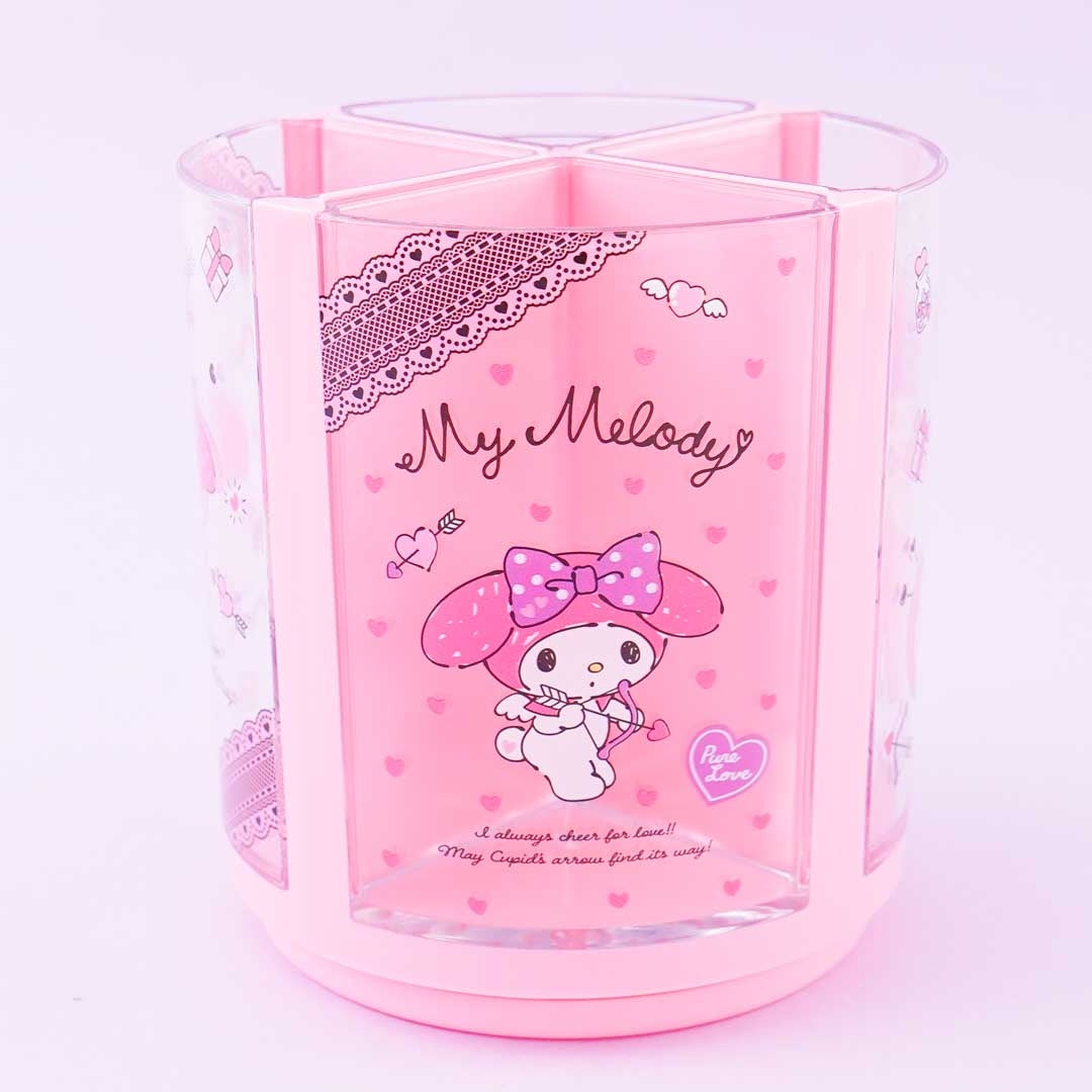 Organize the pens on your desk using this super cute rotating pen stand! It features prints of My Melody as cupid. This pen stand has four removable compartments that you can use.