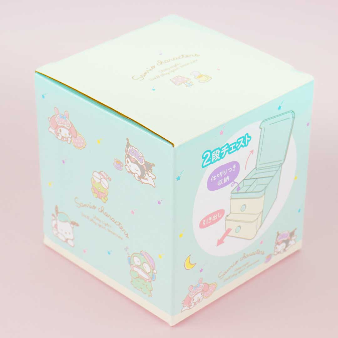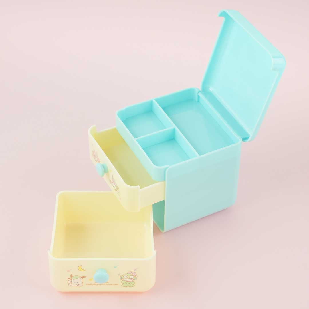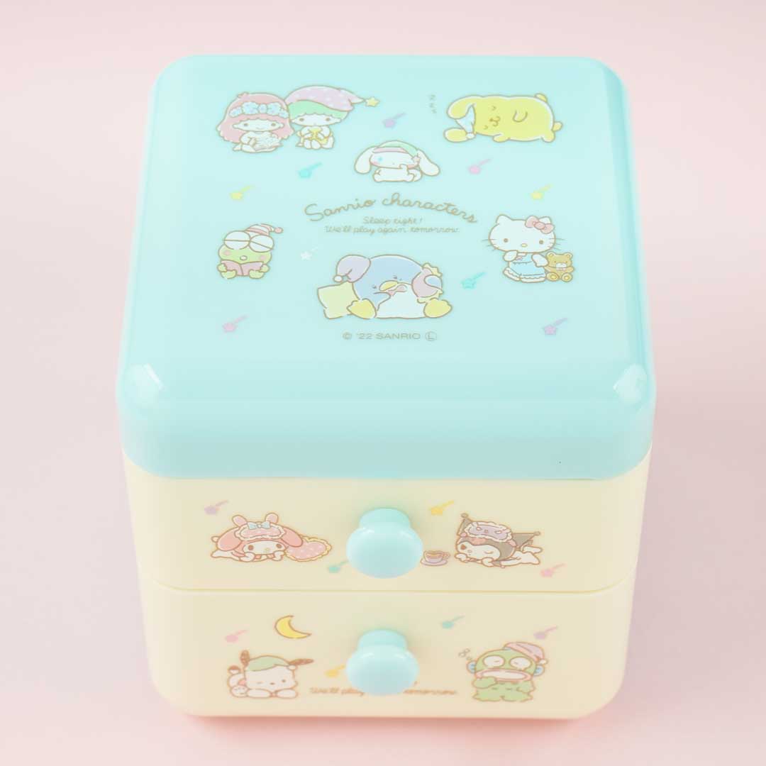 This kawaii chest is decorated with prints of cute Sanrio Characters like Keroppi, Cinnamroll, and more! It also has two pull-out drawers, an upper compartment with several partitions, and a blue lid. Organize your paperclips, thumbtacks, and other small office supplies inside this case!