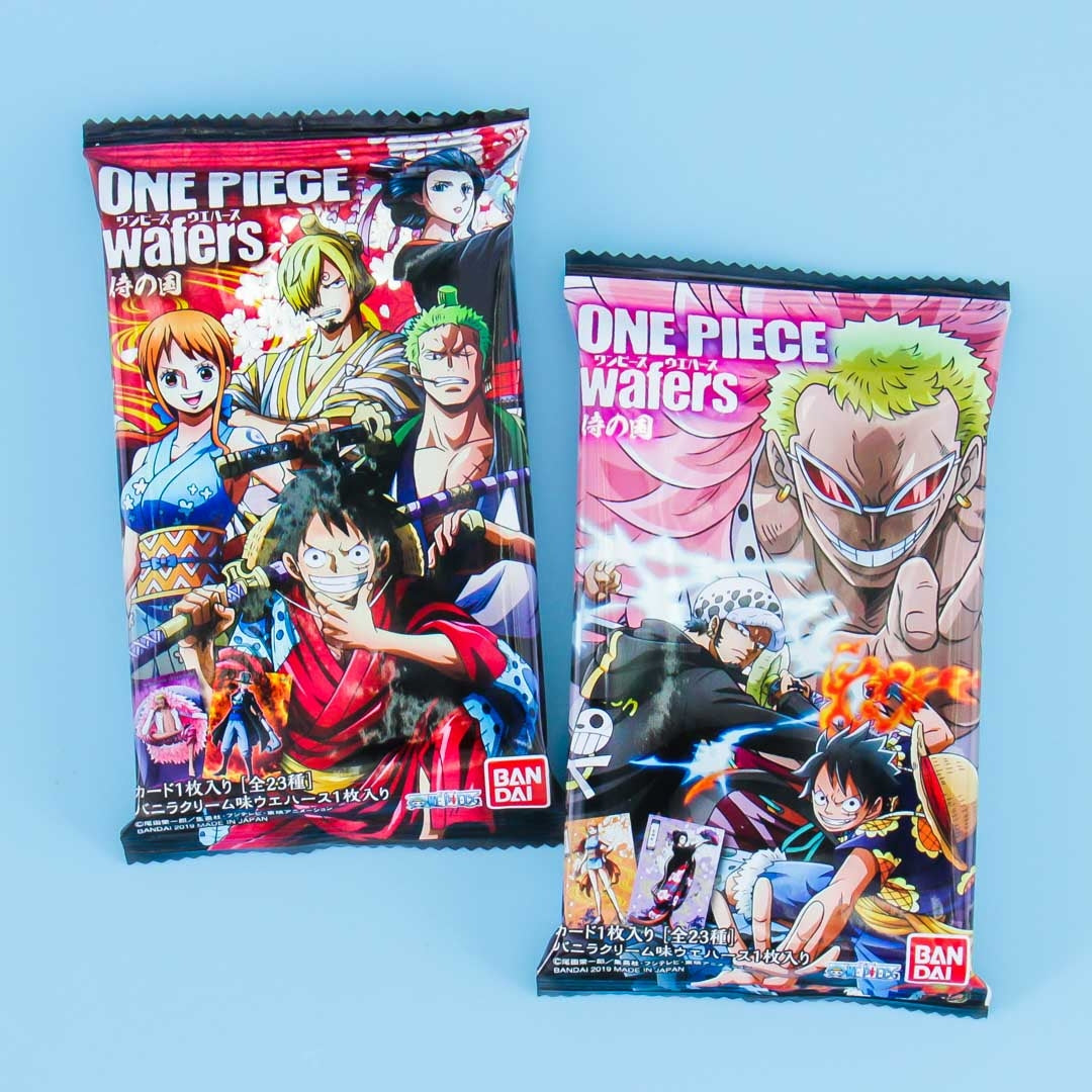 A set of tasty wafer snack and a collectible card featuring One Piece