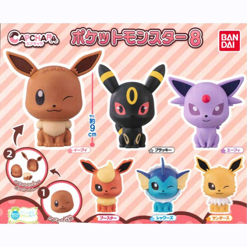 This super cute Eevee collectible is from the "Pokémon 2020 Capchara Vol. 8 Eevee Figure" collection. It’s the eighth series that features an “Eevee-lution” or an Eevee evolution and has its head as the gacha capsule. You can collect all six different designs from this series.