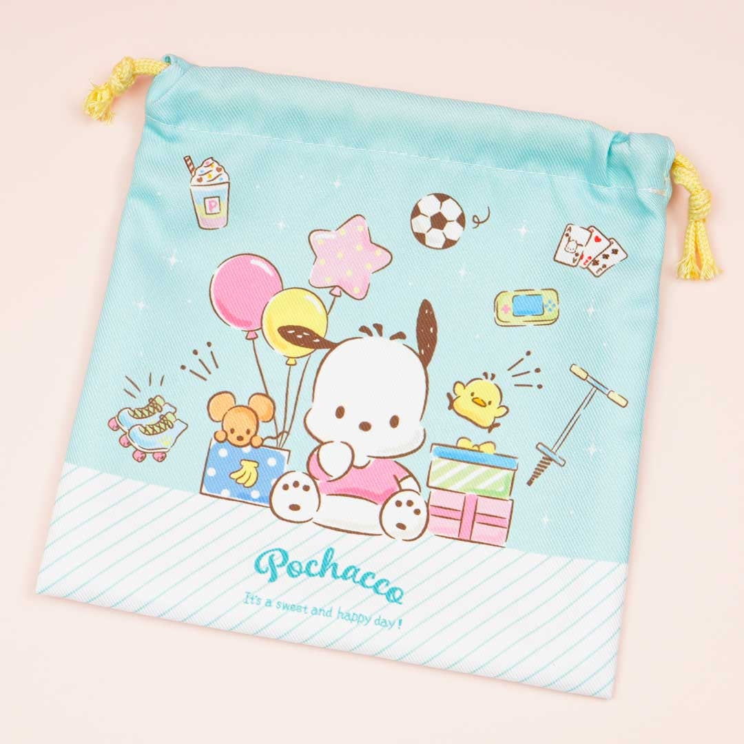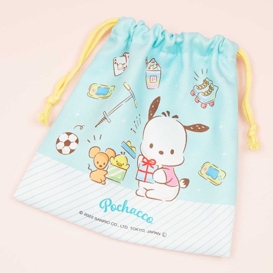 A kawaii drawstring pouch featuring Pochacco with his fave presents
