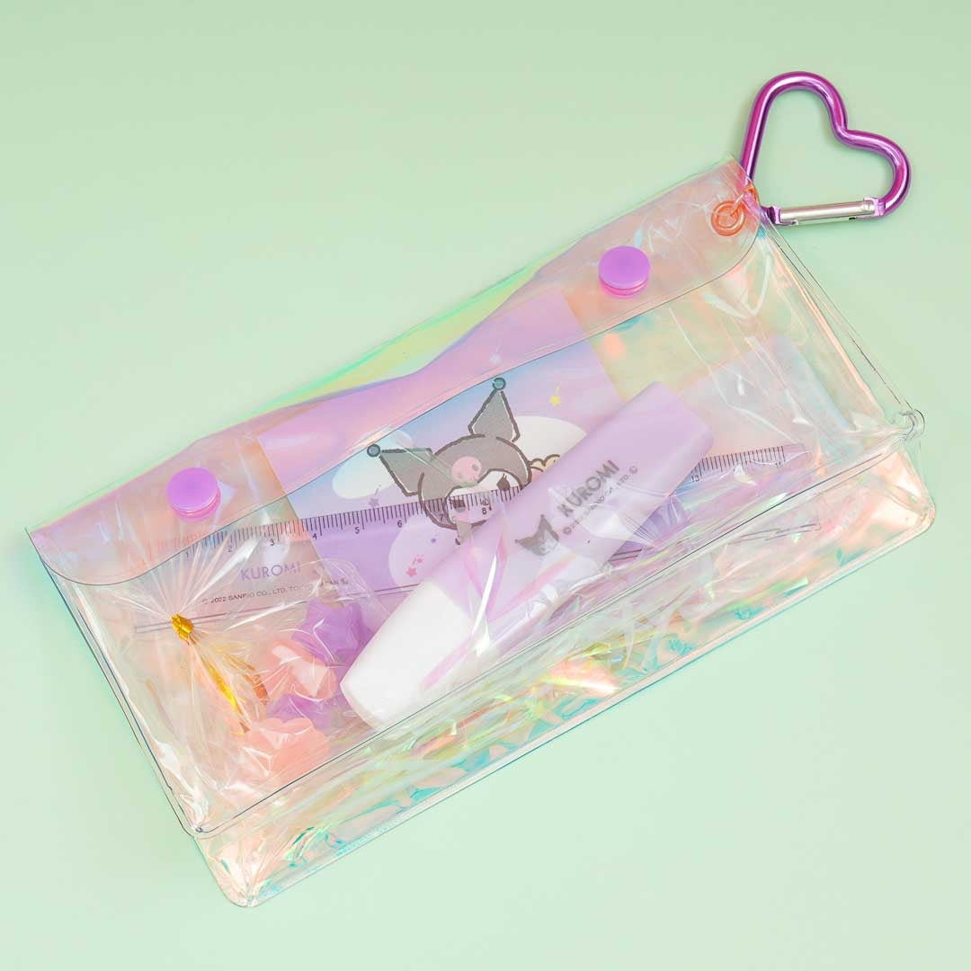 This kawaii stationery set featuring Kuromi is the perfect addition to your collection. It includes a mini memo pad, marker, eraser, a 15 cm ruler, and a clear pouch. You can remove the contents of the pouch and use it to store your other stuff.