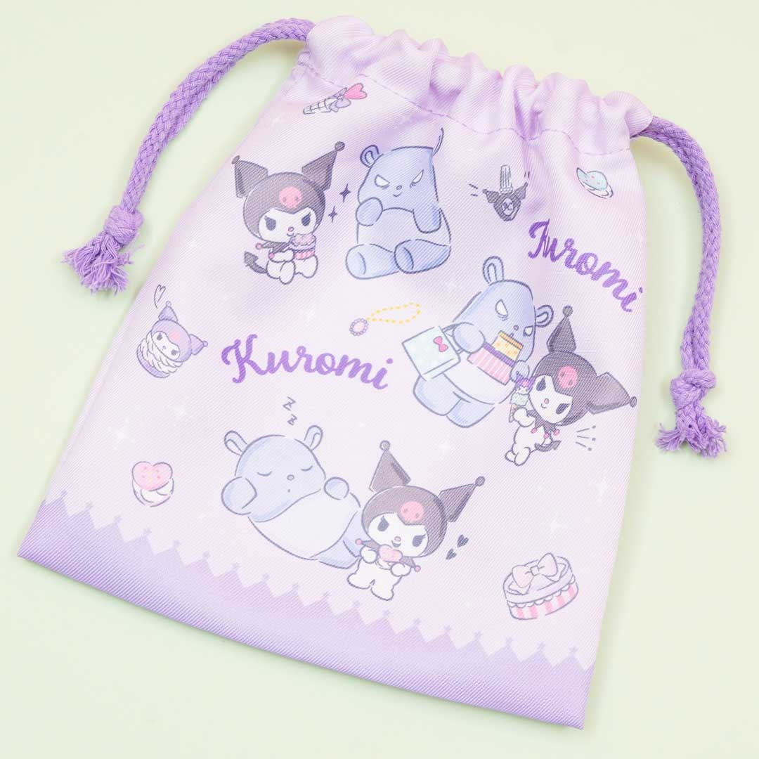 • A kawaii drawstring pouch decorated with prints of Kuromi on a shopping spree