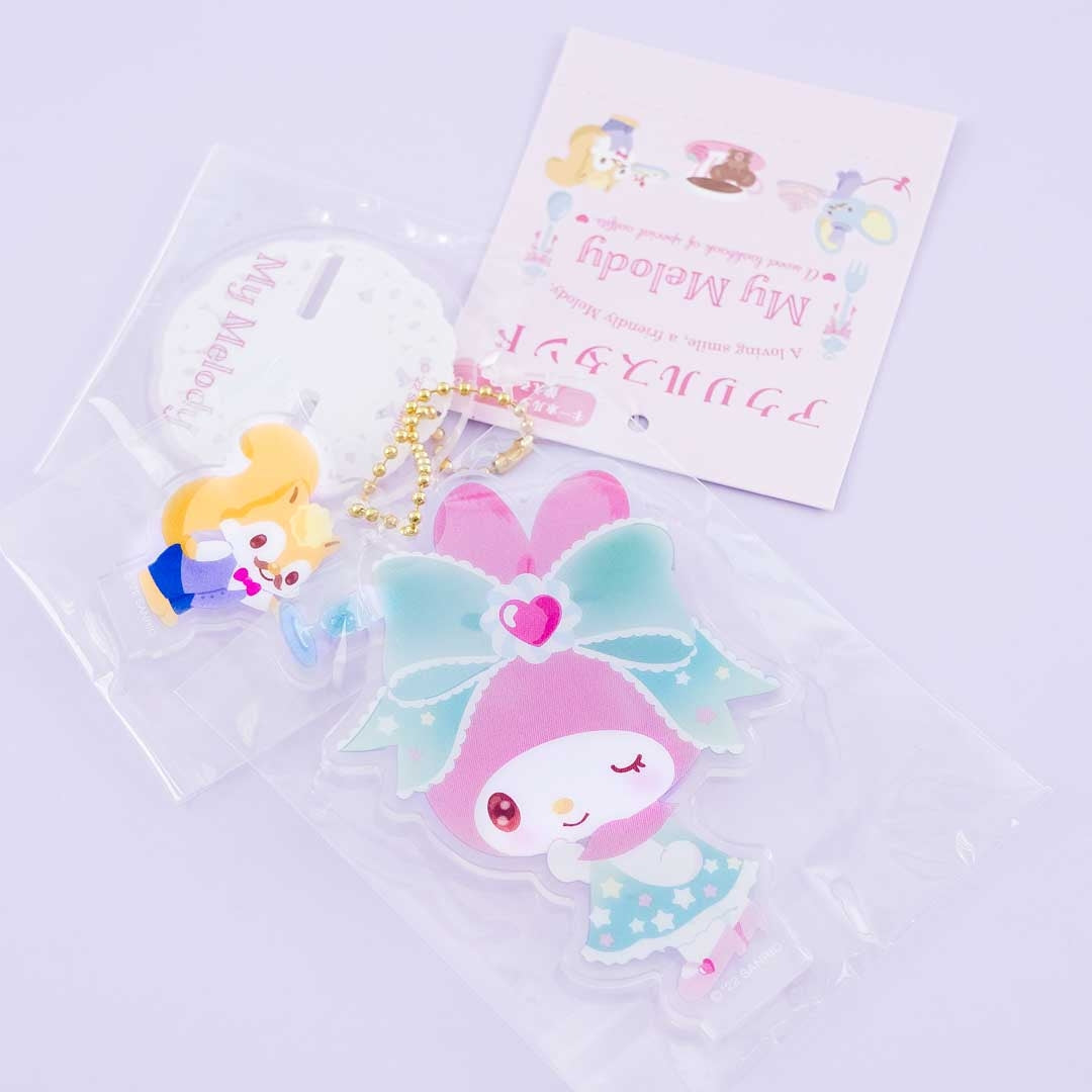 A cute acrylic stand set showcasing My Melody and a chipmunk server carrying some soda