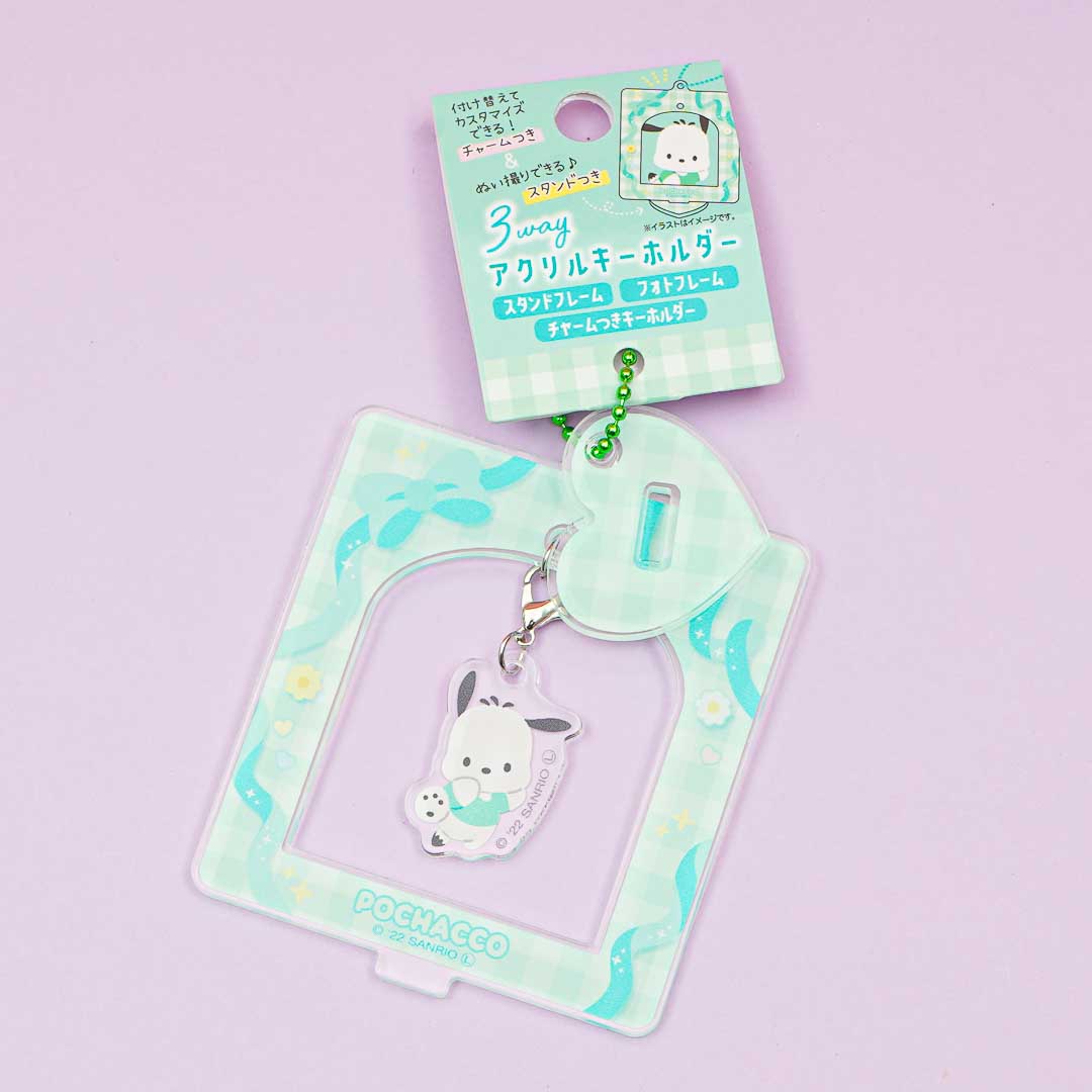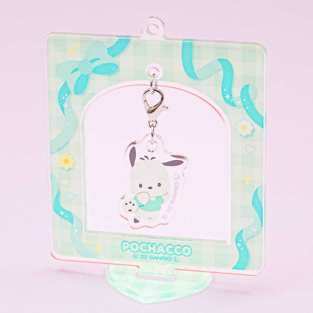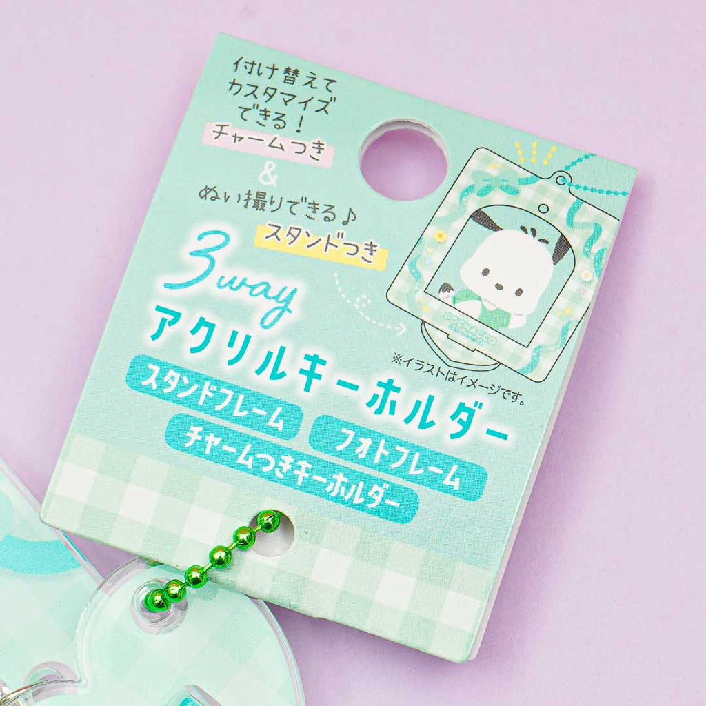 You can use this super cute Pochacco acrylic charm in three various ways! Decorate your favorite shoulder bag by simply attaching it or you can separate the parts so you can transform it into either a kawaii photo frame or a decorative desk stand.
