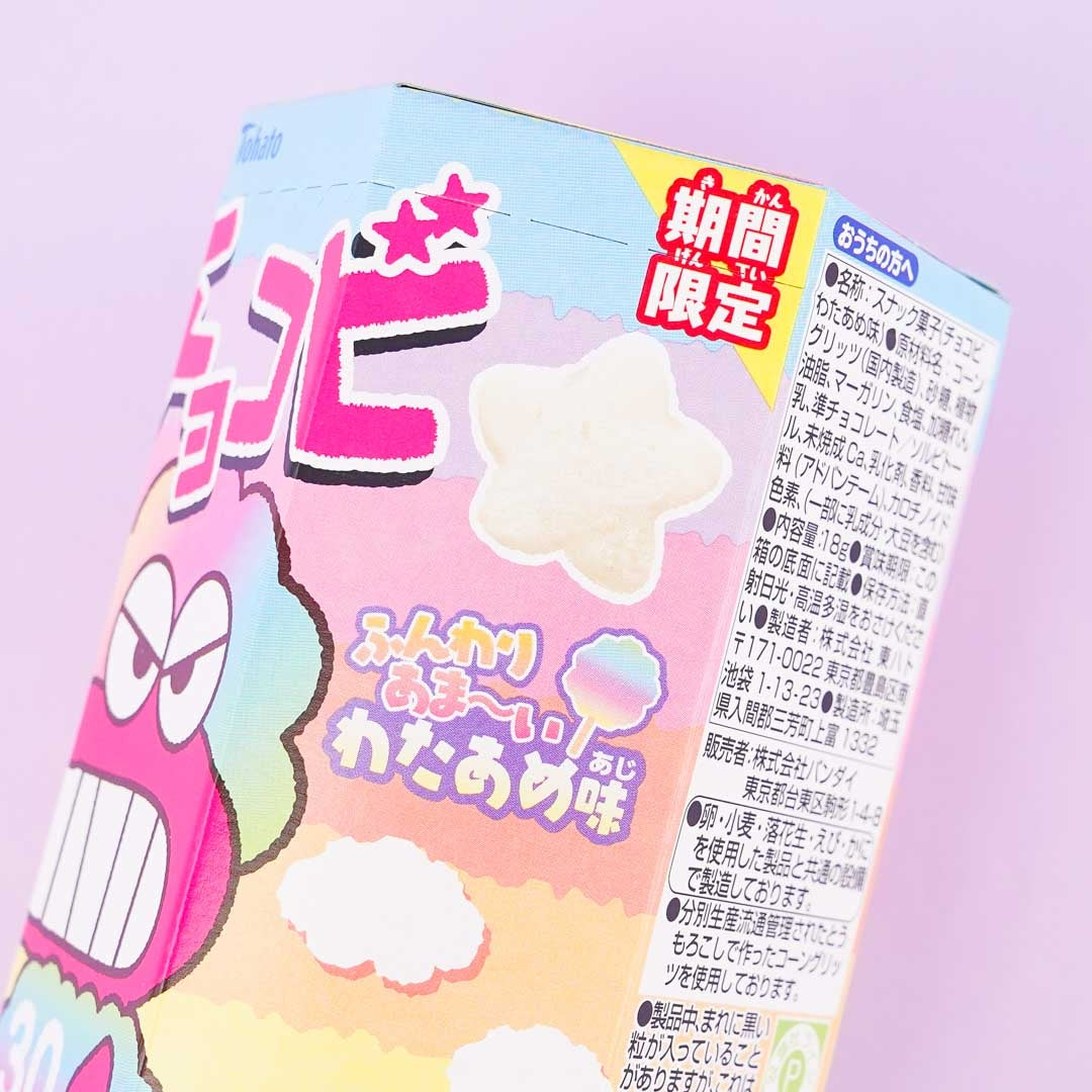Enjoy this limited edition pack of light and crispy corn puffs during your afternoon break! These star-shaped fluffy snacks are coated with sweet cotton candy flavor. Each box comes with a cute Crayon Shin Chan-themed sticker. You'll receive a random sticker design when you order.