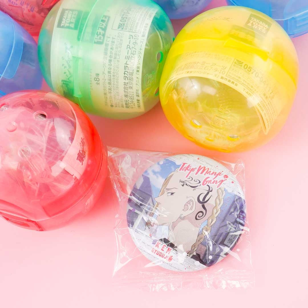 • A colorful gachapon with a tin badge from the "Tokyo Revengers Tin Badge" series