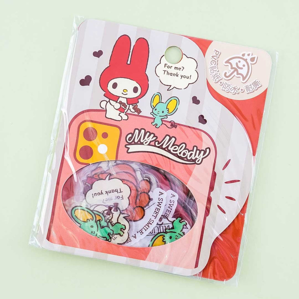 A super cute pack of semi-transparent sticker flakes featuring My Melody and her friends with chocolates