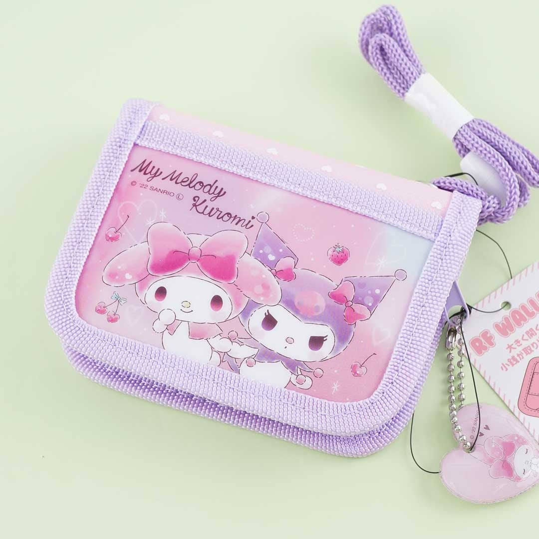Use this super kawaii bi-fold wallet to store your cash and coins. This wallet showcases a print of My Melody and Kuromi spending time together! It has multiple pockets, a zipper closure, and an adjustable strap.