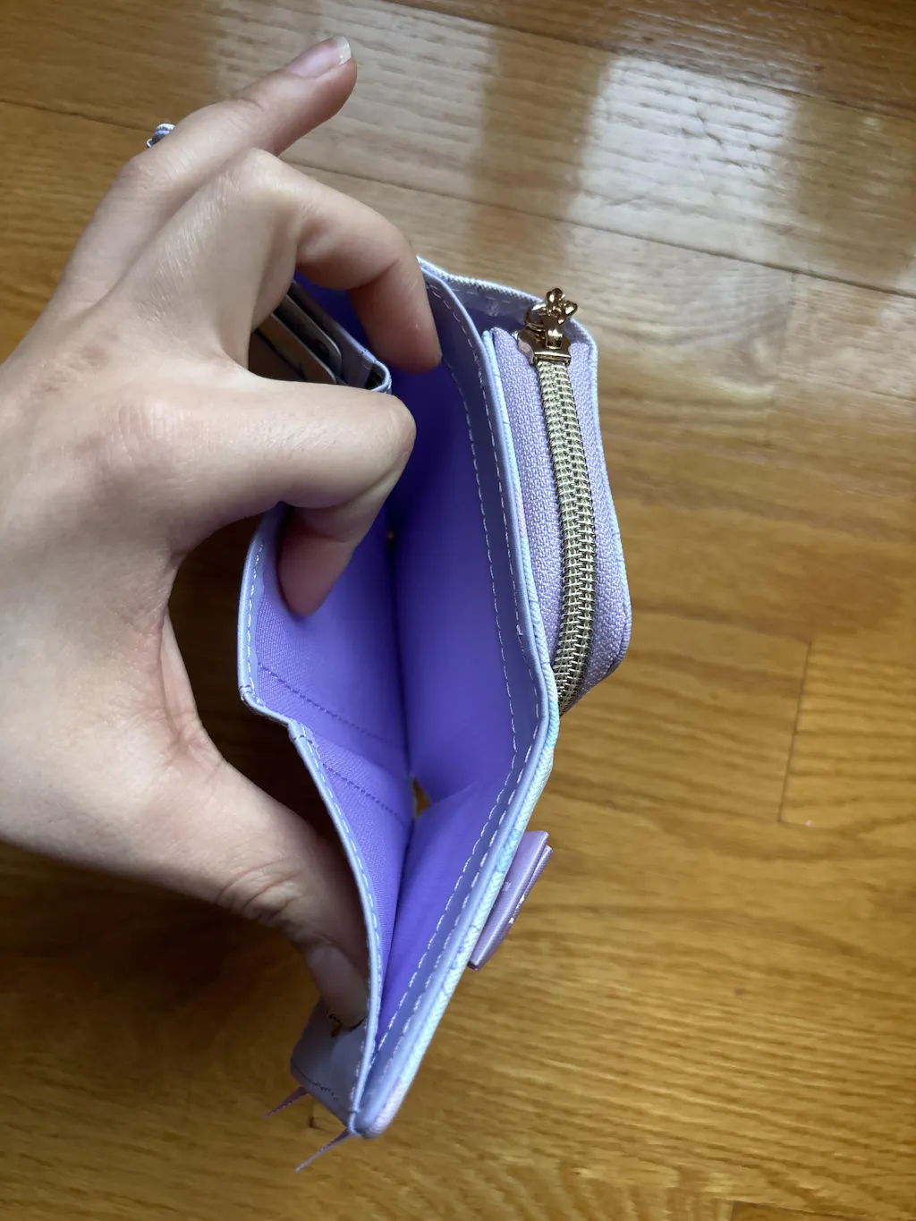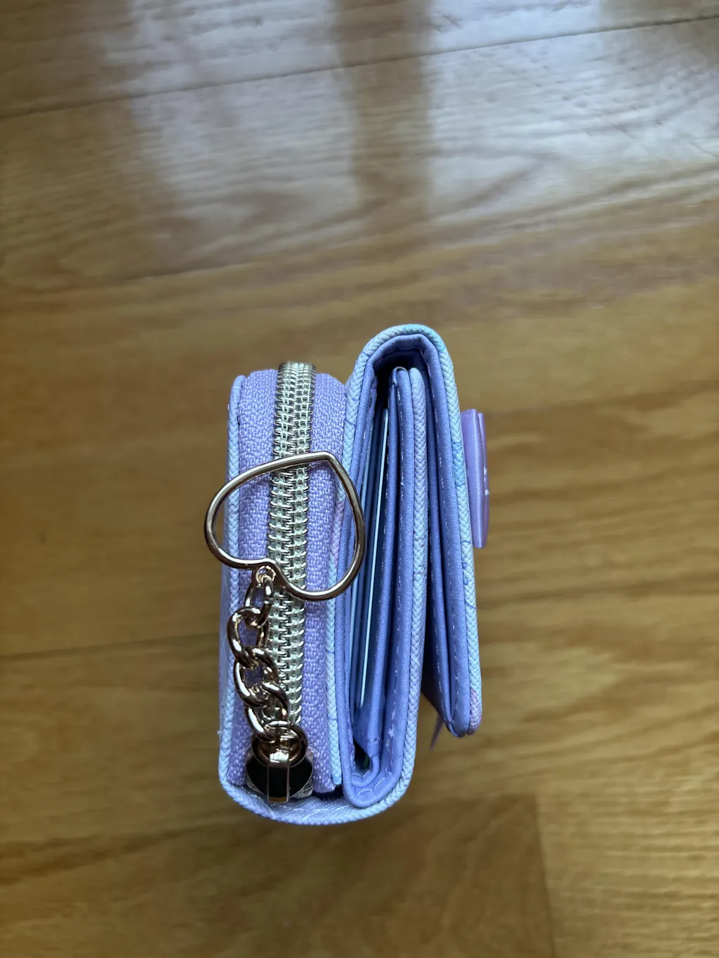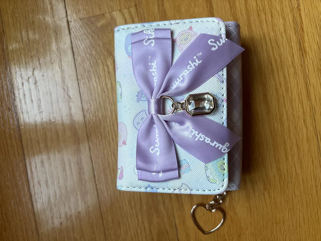 Keep your IDs, train passes, receipts, and loose change safe by placing them all inside this super cute purple tri-fold wallet! It has cute prints of the Sumikko Gurashi characters and plaid patterns. The front has a huge ribbon with a diamond charm and the back has a dedicated zippered coin purse!