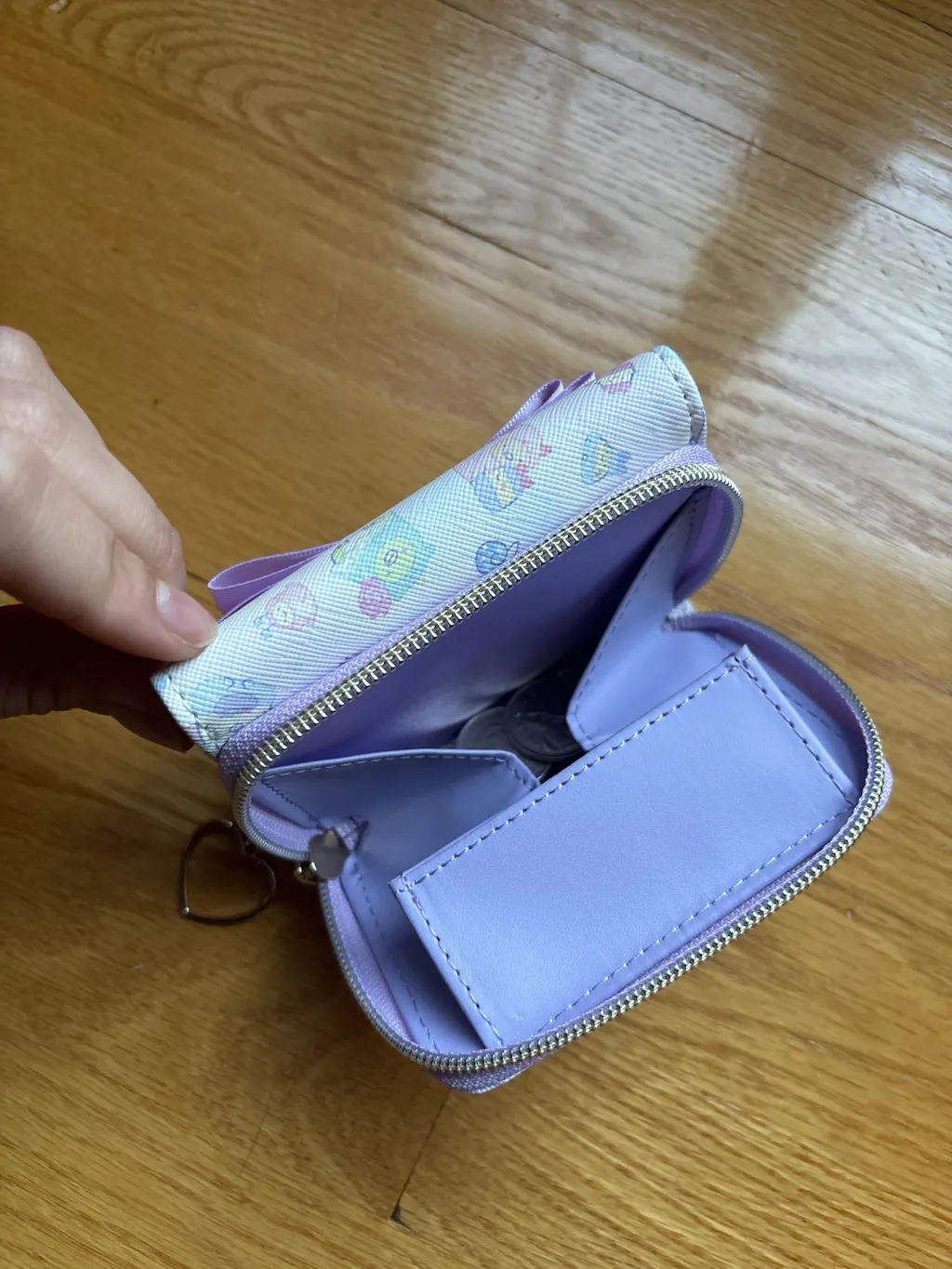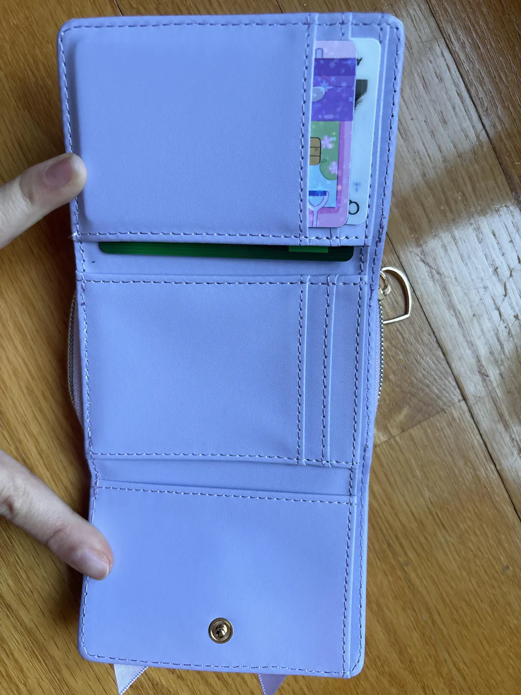 Sooooo cuteeeee and it can hold up to 7 cards and there is a cute coin puch with zipper and a place for cash. It is a small compact wallet that can fit a lot.