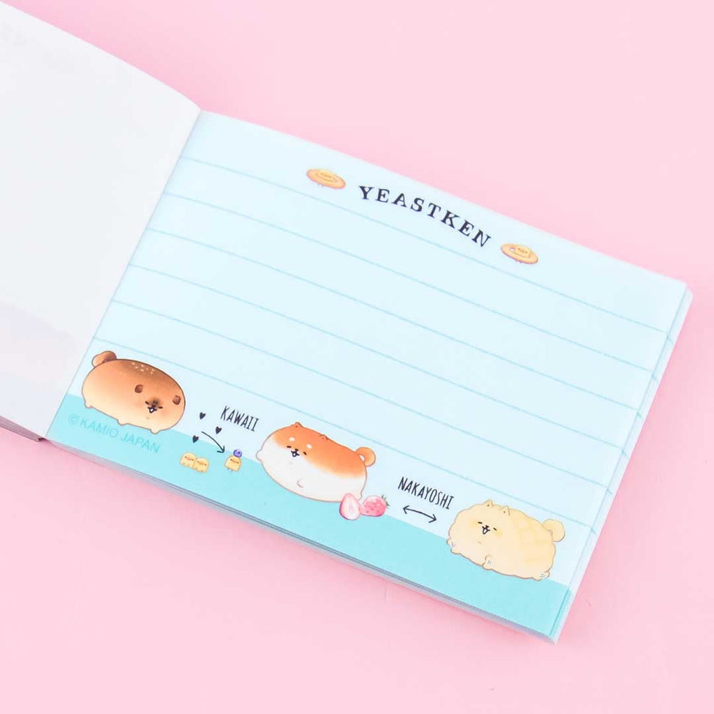 Write sweet notes using this cute memo pad decorated with illustrations of Shibakoppe and other Yeastken characters! It has both lined and blank sheets with two different kawaii dog-bread designs.
