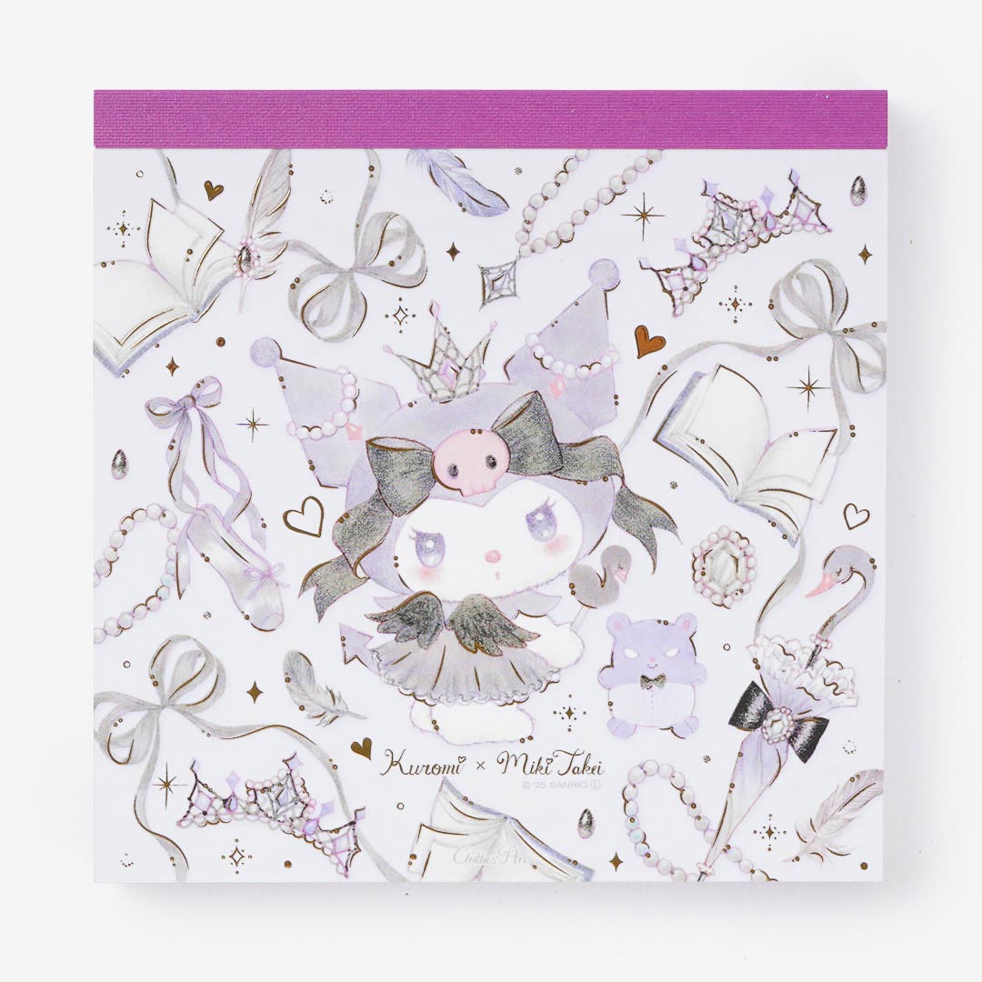 Write down important notes and reminders using this super kawaii memo pad. It comes from a collaboration between Sanrio and the artist Miki Take! This memo pad features prints of Kuromi dressed as a Black Swan ballerina.