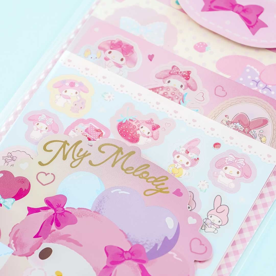 Kawaii-fy your diary with this set of cute die-cut paper stickers! It has over a hundred different designs featuring My Melody having a fun day. The set also comes with an additional large-sized sticker and a folding case that looks like a greeting card.