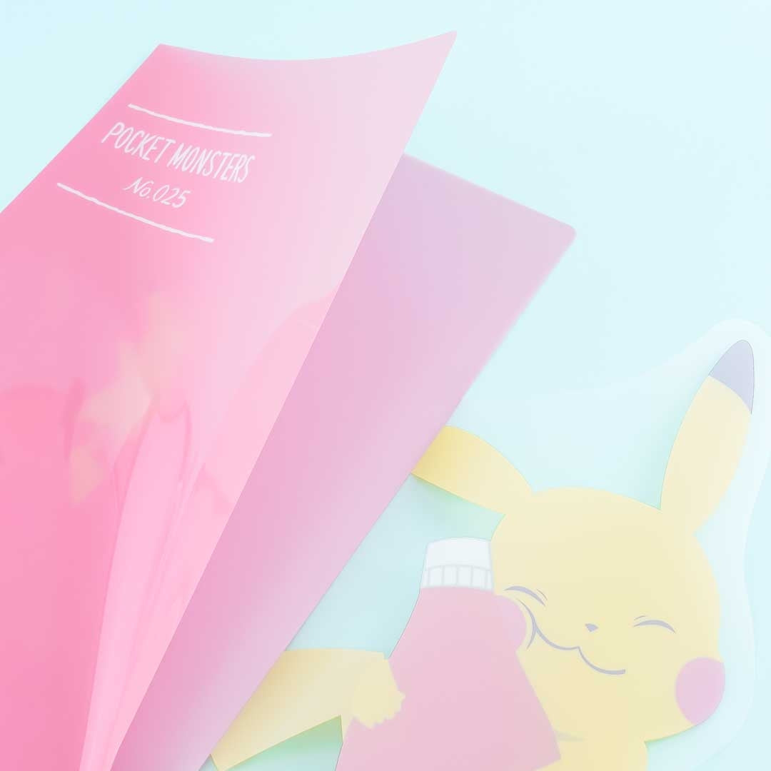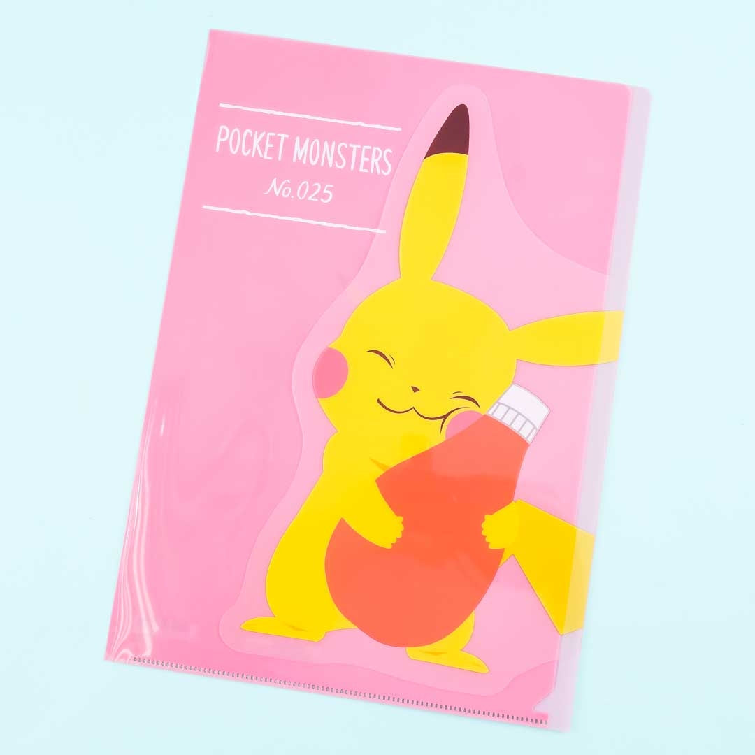 This cute clear file folder features a print of Pikachu lovingly embracing a bottle of ketchup! It has a die-cut flap so that it can secure all your papers. Use this folder to organize your documents.