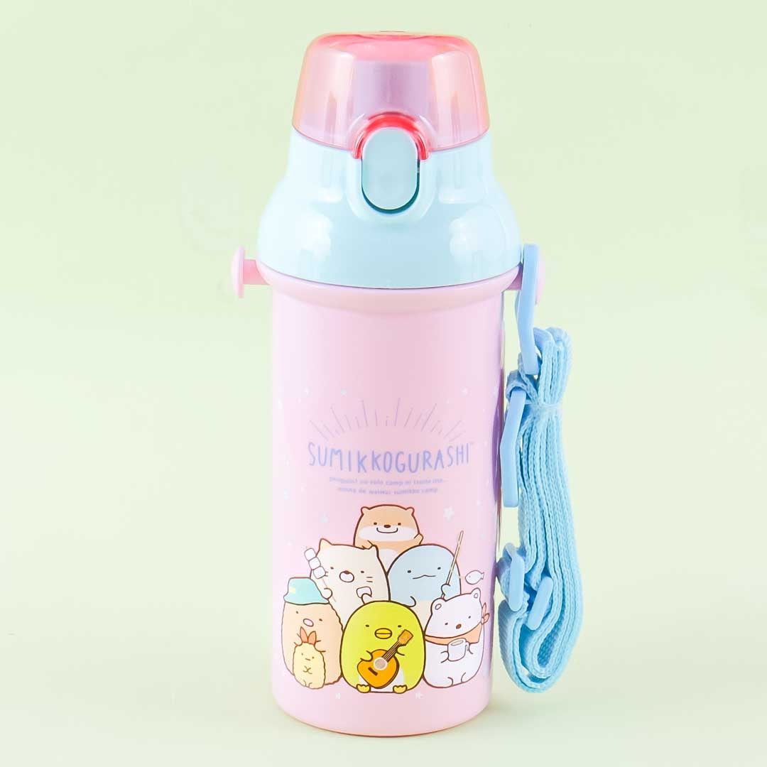 A super cute plastic water bottle featuring the Sumikko Gurashi gang on a camping trip