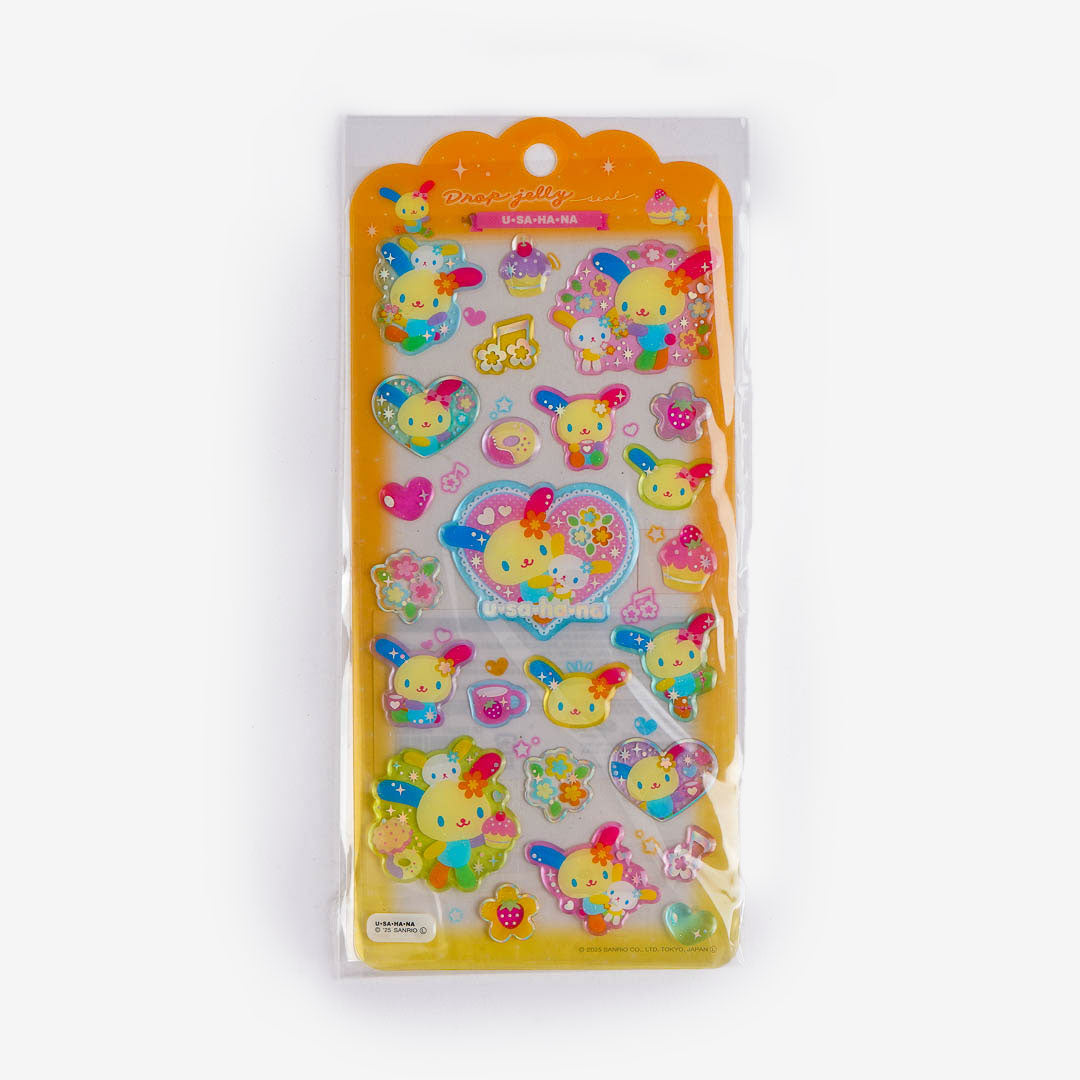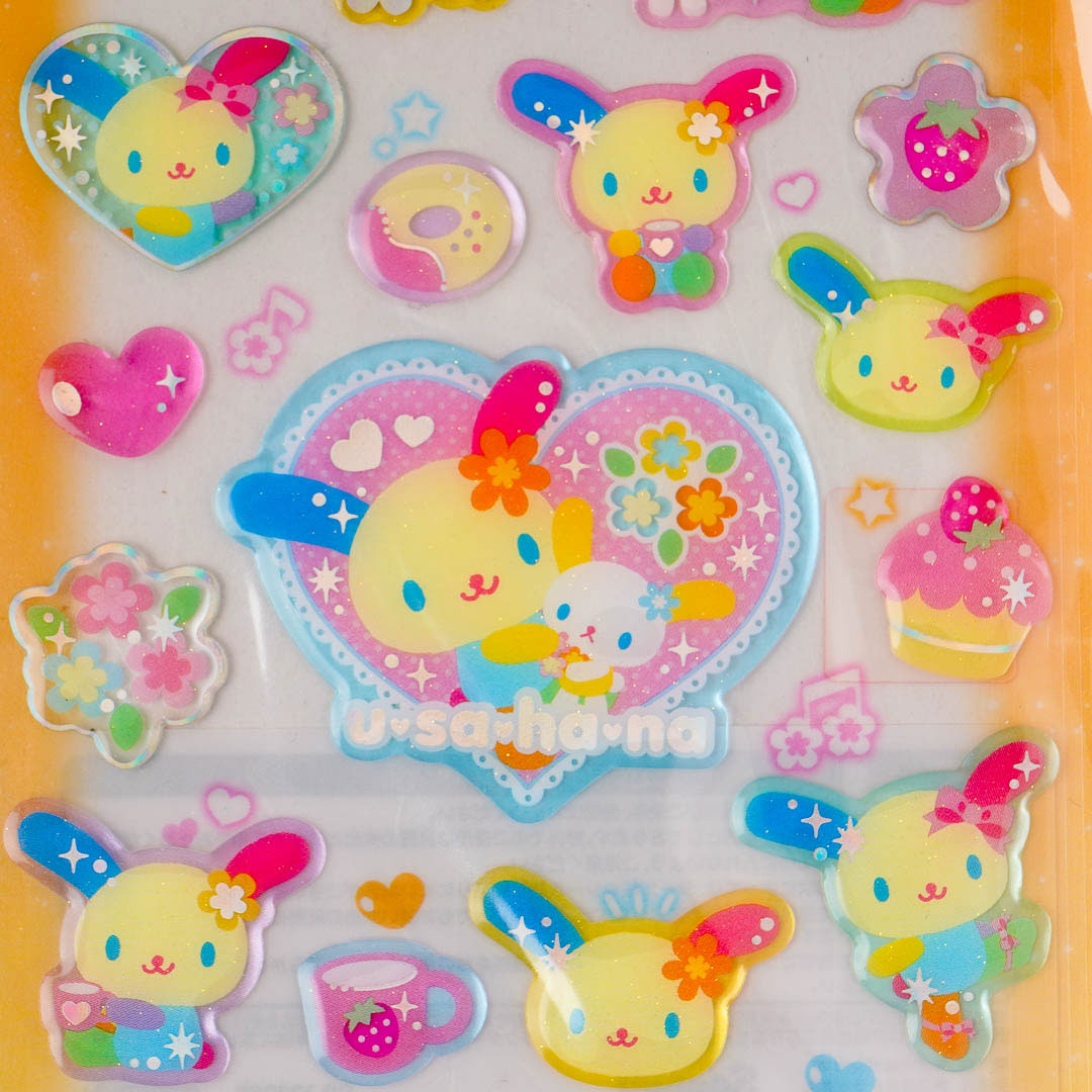 Want to add a sparkle to your notebooks or phone case? This sticker sheet features cute illustrations of Usahana, the rainbow bunny from Sanrio! Each piece has a clear base with hologram foil that makes it look like sparkly jelly. Express your style with these eye-catching stickers!